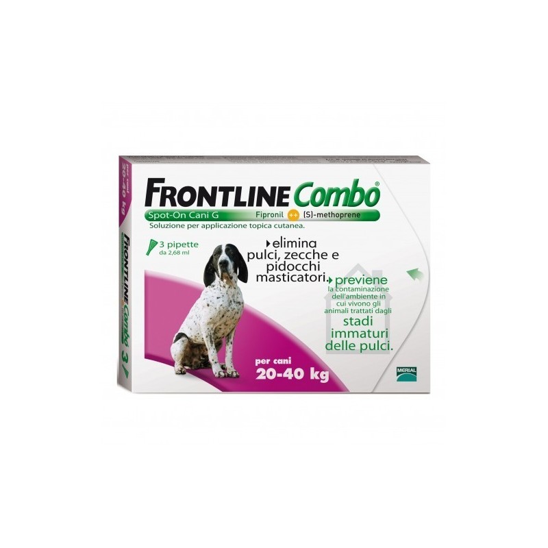 Trattamento dei cani di peso compreso tra i 20 e i 40 kg. Elimina le pulci (Ctenocephalides spp.). L'attività insetticida nei confronti di nuove infestazioni da pulci adulte persiste per 8 settimane. Previene la moltiplicazione delle pulci inibendo lo sviluppo delle uova (attività ovicida), delle pupe e delle larve (attività larvicida) nate dalle uova deposte dalle pulci adulte, per 8 settimane dopo l'applicazione.
