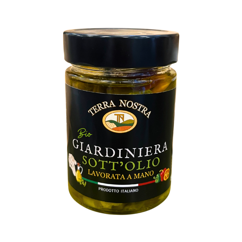 Giardiniera Sott’Olio EVO TERRA NOSTRA è un mix croccante e colorato di verdure di stagione, selezionate con cura e lavorate a mano secondo la tradizione. Senza conservanti, coloranti, aromi o edulcoranti artificiali. Immersa in un raffinato blend di olio extravergine d’oliva e olio di semi di girasole, sprigiona un sapore equilibrato e leggermente acidulo, ideale per arricchire antipasti, insalate o piatti principali. Prodotto biologico certificato IT-BIO-007 (Bioagricert Srl).