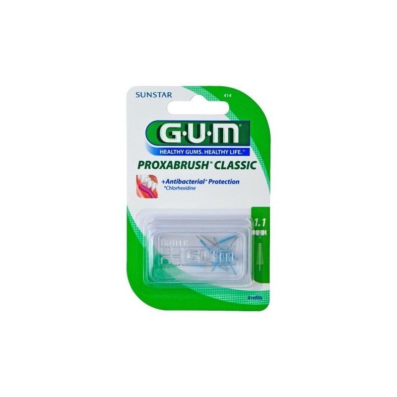 G•U•M PROXABRUSH CLASSIC Scovolini interdentali, con protezione antibatterica alla Clorexidina. Diametro 1,1. Formato 8 pezzi. Cod. 414M8