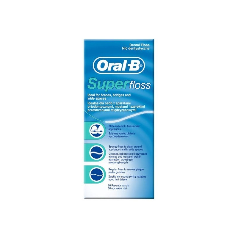 Oral-B Super Floss FILO INTERDENTALE per la pulizia delle aree adiacenti a ponti, corone e apparecchi ortodontici. Modalità d'uso: usare il segmento rigido per inserire la parte spugnosa nella zona da pulire. Far passare delicatamente il filo avanti e indietro negli spazi interdentali per rimuovere ogni deposito di placca. Usare il segmento di filo interdentale non cerato per la pulizia sotto il bordo gengivale. Caratteristiche: clinicamente provato riduce la formazione della placca batterica che può causare gengiviti. Cod. 1268610