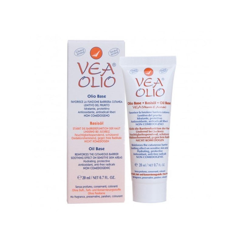 VEA OLIO Olio base, non comedogeno, emolliente, idratante, protettivo. Antiossidante, antirughe. Favorisce la funzione barriera della cute. Lenitivo del prurito. Indicato per cute secca o arrossata, in ogni sede. Screpolature da agenti esterni. Trattamento emolliente delle pelli ruvide e desquamanti. Pelli sensibili, intolleranti o soggette ad allergia. Secchezza o arrossamento genitale o perianale. La commestibilità del prodotto rende il suo uso particolarmente indicato e sicuro come protettivo delle labbra e delle mucose della bocca. Protezione del capezzolo in allattamento. VEA OLIO non contiene conservanti, eccipienti, profumi e coloranti, per minimizzare i rischi di allergia. È resistente all’ossidazione da parte dell’aria, della luce, dei raggi UV ed è quindi stabile nel tempo; è inoltre stabile al calore. È resistente all’ossidazione da parte dell’aria, della luce, dei raggi UV ed è quindi stabile nel tempo; è inoltre stabile al calore. Inoltre, non contiene acqua e quindi non è soggetto ad inquinamento microbiologico. È ottimamente tollerato essendo rarissimi i casi di allergia descritti. Può svolgere un effetto lenitivo del prurito, per la sua azione lipidizzante e contro la secchezza cutanea. Componenti Vitamina E (tocoferolo) acetato pura al 100% (senza eccipienti). Modalità d'uso Applicare in piccola quantità (una goccia) sulle zone da trattare e massaggiare per alcuni secondi fino ad assorbimento completo, almeno due volte al giorno. Poiché la vitamina E è affine ai fosfolipidi di membrana delle cellule epidermiche, il cui turnover (ricambio) avviene mediamente in un mese, per evidenziare il beneficio derivante dall’utilizzo di VEA OLIO possono essere necessari 20-30 giorni di trattamento costante. Sul seno materno in allattamento, per la protezione dalle ragadi: l'applicazione regolare di VEA OLIO sul capezzolo (massaggiando delicatamente per qualche secondo) idrata (rendendola morbida ed elastica) e protegge la cute del seno dai microtraumi legati alla suzione del lattante; si consiglia l'applicazione dopo avere allattato. Non occorre rimuovere prima di attaccare il lattante al seno poiché VEA OLIO è commestibile, inodore ed insapore. Iniziare ad idratare e a massaggiare il capezzolo con il prodotto 20 giorni prima del parto, 2 volte al giorno. Nelle screpolature da superamento della funzione barriera per cause professionali (da agenti esterni): applicare prima del contatto con gli agenti chimici o i detergenti aggressivi e riapplicare più volte durante il lavoro, sempre prima del contatto, quando non si apprezza più il “film protettivo” cutaneo. Negli arrossamenti dopo esposizione solare: applicare alla sera per un effetto lenitivo del prurito. Si consiglia di spruzzare VEA SPRAY sopra VEA OLIO e quindi massaggiare: ciò permette di stendere in modo più omogeneo VEA OLIO. Avvertenze Non usare in caso di allergia nota agli ingredienti. Conservare fuori dalla portata dei bambini. Conservazione Validità a confezione integra: 36 mesi. Formato Tubo 20 ml. BREVETTO EUROPEO.