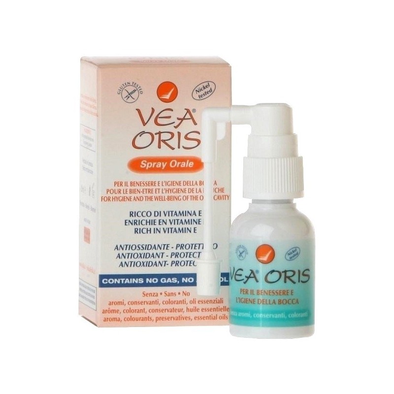 VEA ORIS Spray orale VEA ORIS contiene Olio VEA (Vitamina E acetato pura), con azione antiossidante e protettiva per l’igiene e il benessere del cavo orale. La formulazione semplice (2 soli ingredienti) e testata per il nichel e per il glutine, l’assenza di alcool, aromi, conservanti e coloranti, rendono VEA ORIS particolarmente indicato nei soggetti intolleranti, allergici, con iperreattività della mucosa o con idiosincrasia. Modalità d'uso Spruzzare sulle mucose della bocca 2-3 volte al giorno. Avvertenze Non utilizzare in caso di allergia nota agli ingredienti. Tenere fuori dalla portata dei bambini. Conservazione Validità a confezione integra: 36 mesi. Formato Flacone da 20 ml, con applicatore. Cod. VEAORIS BREVETTO EUROPEO.
