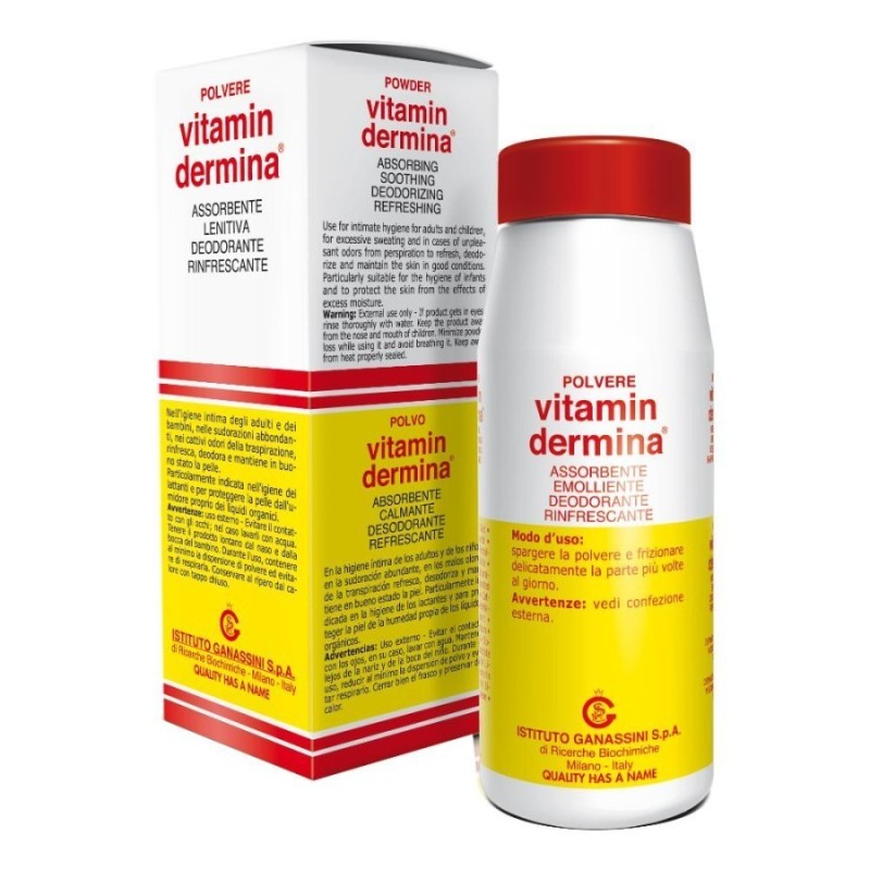 POLVERE vitamin dermina ASSORBENTE EMOLLIENTE DEODORANTE RINFRESCANTE Prodotto indicato nell'igiene intima degli adulti e dei bambini, nelle sudorazioni abbondanti, nei cattivi odori della traspirazione; deodora e mantiene in buono stato la pelle. Particolarmente indicata nell'igiene dei lattanti e per proteggere la pelle dall'umidore proprio dei liquidi organici. Clinicamente, dermatologicamente e microbiologicamente testata. Formato 100 g Cod. 67
