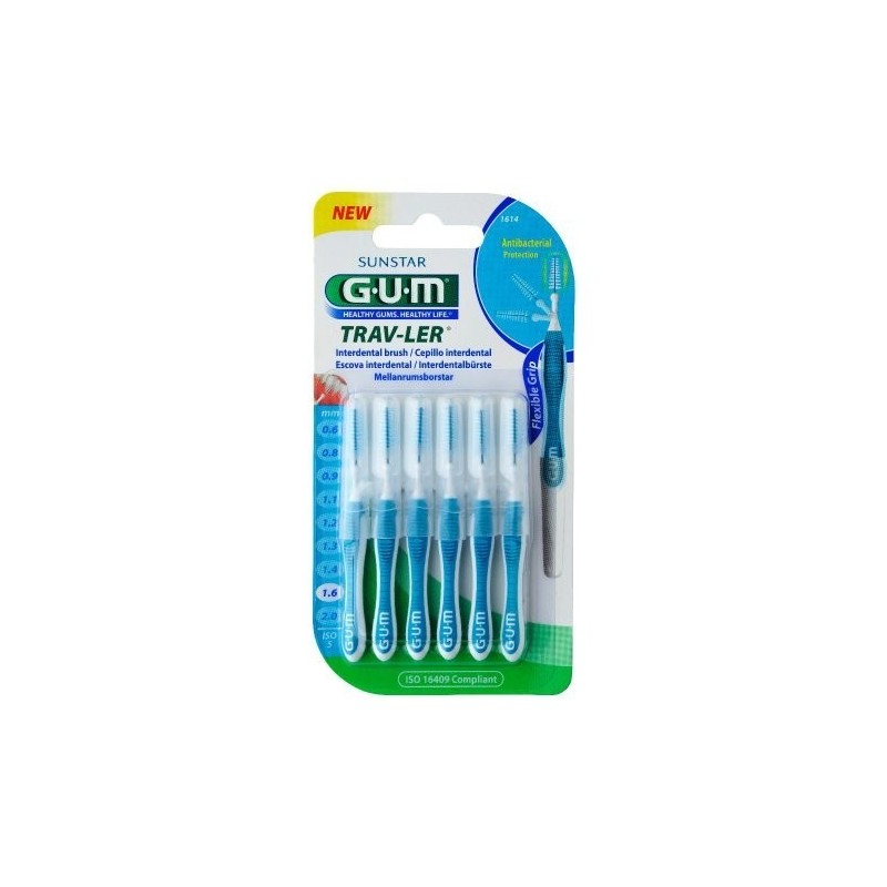 GUM TRAV-LER 1,6 SCOVOLINO Descrizione Il nuovo GUM Trav-Ler è stato disegnato per garantire massimo comfort ed efficacia: - rimuove fino al 25% in più di placca rispetto ad una setola tradizionale in nylon grazie all'innovativo design triangolare del filamento; - il nuovo manico ergonomico garantisce massimo comfort e controllo grazie al manico più lungo, flessibile e antiscivolo. Il collo pieghevole permette un facile accesso ai denti posteriori; - per ridurre il rischio di trauma ed evitare danni allo smalto dei denti, il filo è ricoperto e la punta del manico è arrotondata per assicurare la protezione delle gengive; - le setole sono trattate con clorexidina, un agente antibatterico, per mantenere lo scovolino pulito fra un uso e l'altro e per prevenire la contaminazione; - il cappuccio salva-igiene ricopre la duplice funzione di protezione dello scovolino e di estensione del manico per un facile accesso ai denti posteriori; - una linea completa di 8 scovolini interdentali, dal più sottile al più largo, per l'igiene completa di tutti gli spazi interdentali. Formato 4+2 pezzi Cod.1614HP