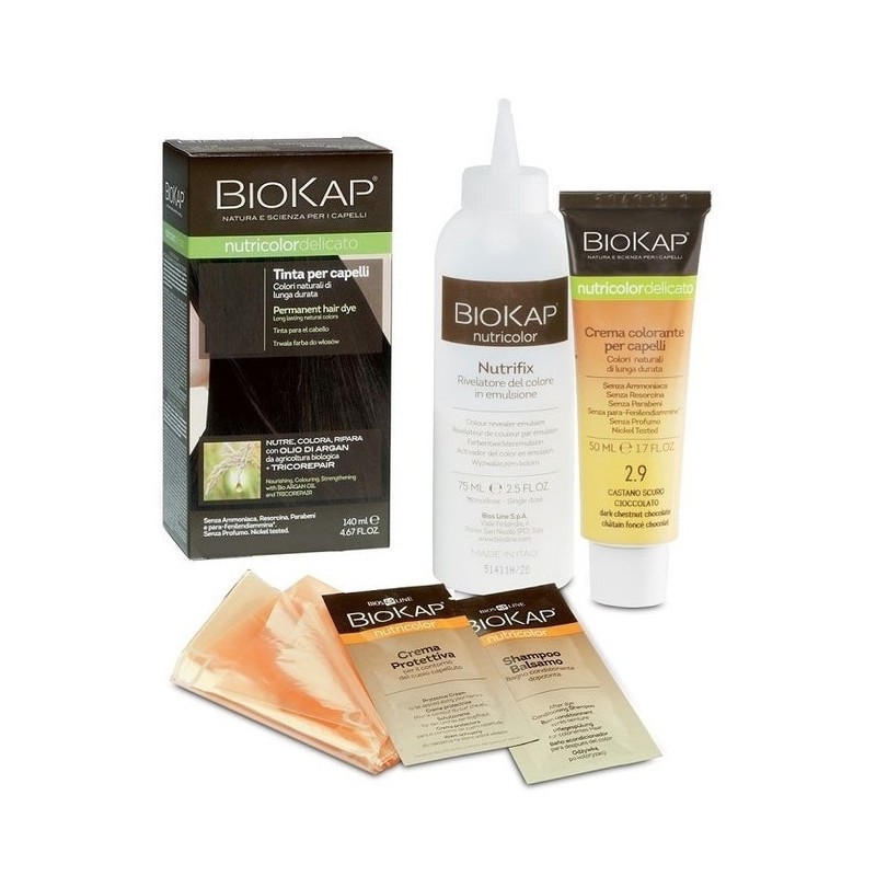 Biokap Nutricolor Tinta Delicato 5.0 Castano chiaro naturale DescrizioneLa formula a base di ingredienti vegetali e ad alta tollerabilità cutanea nutre e ripara i capelli mentre li colora e copre i capelli bianchi. Complesso Tricorepair a base di proteine del Riso ad azione ristrutturante, derivato del Salice con azione protettiva del colore e acidi lipofili della frutta che si prendono cura del cuoio capelluto durante il periodo di applicazione della tinta. L'Olio di Argan, per l'elevato contenuto di acidi grassi insaturi e vitamina E, protegge, ristruttura e rende luminosi i capelli sfibrati e fragili. Per una colorazione di lunga durata. Senza Ammoniaca, Resorcina, Parabeni e para-Fenilendiammina. Senza Profumo. Nichel tested. Modalità d'uso Inserire il flacone Nutrifix nel foro indicato dal tratteggio sul retro dell'astuccio ed indossare la mantellina protettiva monouso contenuta all'interno della confezione. Miscelare il contenuto del tubo del colore. Avvertenze Prima dell’uso leggere attentamente le istruzioni riportate sulla confezione. Effettuare sempre un test di sensibilità 48 ore prima di ogni applicazione. Conservazione Conservare a temperatura ambiente. Validità a confezionamento integro: 36 mesi. FormatoConfezione contenente: - crema colorante da 50 ml (tubo); - rivelatore da 75 ml (flacone); - shampoo balsamo - bagno condizionante dopo tinta 15 ml (bustina); - crema protettiva per il contorno del cuoio capelluto 5 ml (bustina); - mantellina protettiva monouso. Cod. ND00500