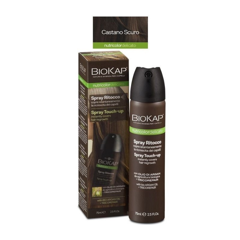 Biokap Nutricolor Spray Castano Scuro DescrizioneIdeale per avere un colore sempre impeccabile e uniforme tra una colorazione dei capelli e l'altra. Copre in un attimo la ricrescita con un effetto naturale e omogeneo, come una tinta appena fatta. Si assorbe rapidamente, non lascia residui e per eliminarlo basta uno shampoo. Inoltre, nutre e rigenera i capelli. Contiene, infatti, Tricorepair, un complesso a base di Proteine del riso ad azione ristrutturante, Tridecyl salicylate, un derivato del salice che ha la funzione di proteggere il capello dai raggi UV e dallo scolorimento, e Acidi lipofili della frutta. La formula è arricchita anche con Pantenolo (Vitamina B5) per donare idratazione e protezione al capello e Olio di Argan biologico, per aiutare a prevenire la secchezza del capello. Profumo senza allergeni. Privo di Siliconi, SLS, SLES e Parabeni. Dermatologicamente testato. Nickel tested. Modalità d'uso - Agitare bene la bombola; - vaporizzare il prodotto a circa 15 cm sulla zona da coprire: lo spray senza beccuccio creerà un colore uniforme; - attendere un minuto prima di toccare i capelli; - pettinare delicatamente i capelli per un effetto più naturale. Formato Flacone da 75 ml. Cod. NS002