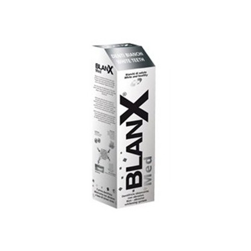 BLANX Med DENTI BIANCHI Dispositivo Medico CE. Pasta dentifricia con un'azione contro le discromie dentali: protegge l'integrità dello smalto evitando l'adesione della placca e contrastando l'ingiallimento dentale. Grazie alla particolare sinergia tra Licheni Artici e l'azione degli Ioni Fluoro, Blanx Med Denti Bianchi è una pasta dentifricia nota per avere un'azione remineralizzante e sbiancante senza azione abrasiva sullo smalto. Modalità d'uso Spazzolare i denti come di consueto e risciacquare dopo l'uso. Utilizzare almeno 2 volte al giorno, dopo i pasti principali. Formato Dispenser da 100 ml. Cod. GA0325200