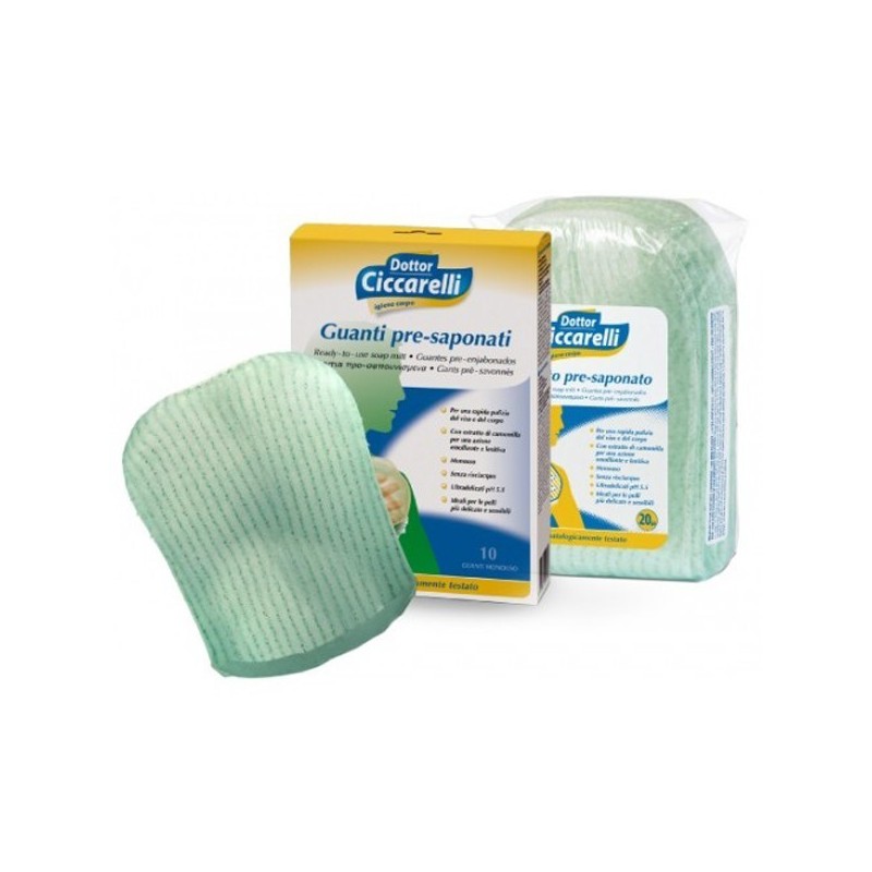 Dottor Ciccarelli Guanto Pre-Saponato Guanto presaponato per una rapida pulizia del viso e del corpo senza bisogno di risciacquo. Pratico e monouso, è composto da una spugna già saponata e da un supporto in tessuto di colore bianco. La spugna, a contatto con alcune gocce d'acqua, diventa morbidissima, sprigionando una piacevole schiuma che deterge la pelle senza irritarla. Contiene elementi ad attività detergente, acidificanti fisiologici, come l'acido citrico che bilanciano il pH della pelle ed estratto di camomilla, dalla funzione lenitiva ed emolliente. È ideale in situazioni disagiate ma anche per una igiene quotidiana d'emergenza: in viaggio, in campeggio, in ospedale. Dermatologicamente testato. Formato Confezione da 10 e da 20 guanti. Cod. 0201Z00 / 0201W01