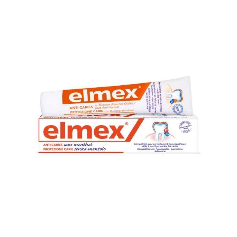 Elmex Dentifricio SENZA MENTOLO per l'igiene orale quotidiana e per la protezione della carie. Caratteristiche: dentifricio privo di mentolo e menta piperita, protegge efficacemente dalla carie ed è testato clinicamente. Componenti: aqua, sorbitol, hydrated silica, hydroxyethylcellulose, olaflur, titanium dioxide, aroma, saccharin, fluoro amminico. Cod. 30004559