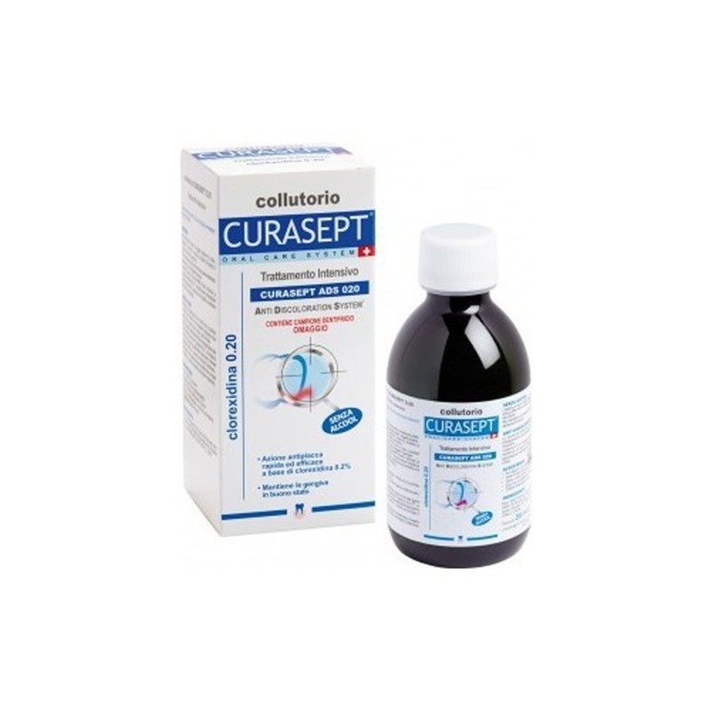Curasept ADS COLLUTTORIO - particolarmente indicato per i portatori di protesi, impianti, apparecchi ortodontici. - può essere utilizzato anche in caso di problemi al parodonto. - Ideale prima e dopo un trattamento odontoiatrico per proteggere le gengive. Modalità d'uso: proseguire con le applicazioni per una settimana e rivolgersi al dentista in caso sia necessario prolungare il trattamento. Caratteristiche: trattamento intensivo alla Clorexidina (0,20) con A.D.S., ad azione antiplacca. Mantiene le gengive in buono stato. L'assenza di alcool evita effetti irritanti e dolorosi, soprattutto in presenza di mucose infiammate. Cod. SEPT02