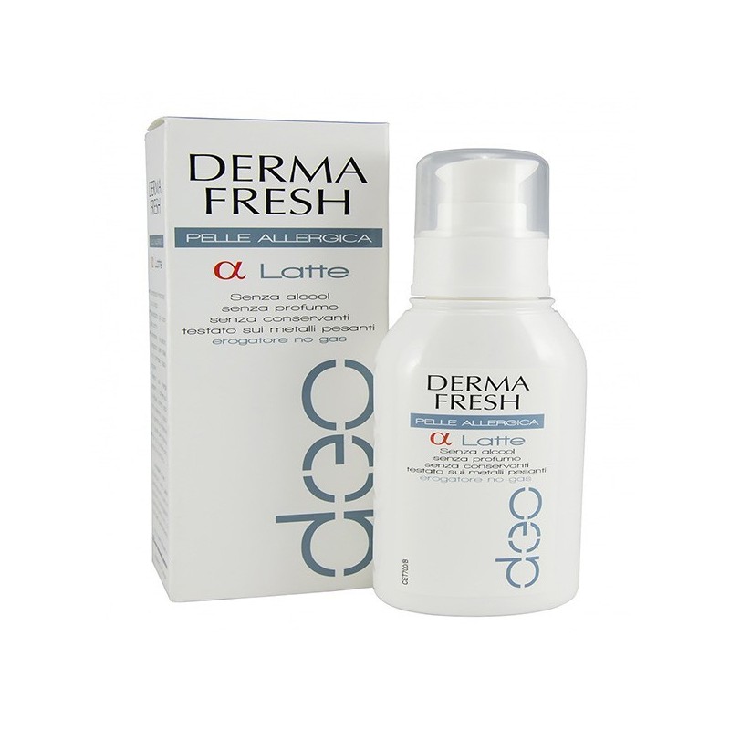 DERMA FRESH PELLE ALLERGICA alfa Latte Descrizione Deodorante per pelli sensibili, facilmente irritabili e che non tollerano i comunideodoranti. Ipoallergenico, senza propellenti, previene la formazione di cattivi odori elascia sulla pelle una gradevole sensazione di freschezza di lunga durata. Testato su metalli pesanti (nichel, cromo, cadmio, arsenico, cobalto e piombo). Modalità d'uso Applicare sulla pelle perfettamente pulita e asciutta e massaggiare delicatamente fino acompleto assorbimento. Componenti Aqua, aluminum chlorohydrate, PPG-15 stearyl ether, steareth-2, steareth-21. Avvertenze Uso esterno. Non utilizzare in caso di ipersensibilità ad uno degli ingredienti. Evitare il contatto con gli occhi. Non ingerire. Conservazione Conservare in luogo fresco e asciutto. Validità post-apertura: 12 mesi. Formato Flacone da 100 ml.