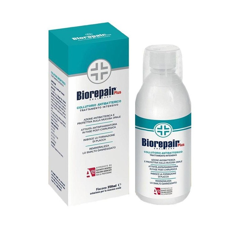 BIOREPAIR COLLUTORIO ANTIBATTERICOTrattamento intensivo Descrizione Collutorio con probiotici che aiuta a proteggere la mucosa orale dalle infiammazioni alleviandone i sintomi e che inibisce la formazione di placca.Remineralizza lo smalto danneggiato.Particolarmente indicato in soggetti predisposti a lesioni gengivali e con difese immunitarie indebolite. Modalità d'uso Si consiglia l'uso dopo essersi lavati i denti, due volte al giorno per due settimane. Formato Bottiglia da 250 ml. Cod. GA163100