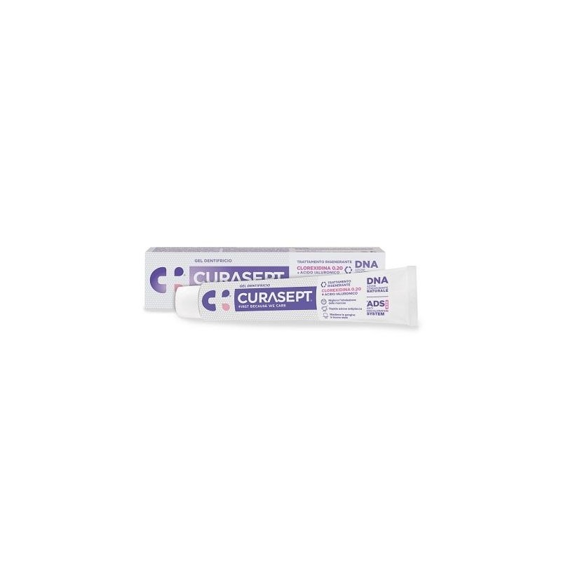 CURASEPT ADS | DNA GEL DENTIFRICIO TRATTAMENTO RIGENERANTE Descrizione Curasept Gel Dentifricio Ads contiene una formula a base di clorexidina 0,20, acido ialuronico e DNA/RNA vegetale, coadiuvante nei processi rigenerativi della mucosa orale e gengivale. Trattamento rapido antiplacca particolarmente indicato in tutti i casi dove è necessaria una normalizzazione più rapida delle lesioni assicurando il successo delle procedure odontoiatriche con risultati più soddisfacenti per il paziente. L’l'acido ialuronico 0,2% forma un film protettivo sulle mucose e sulle gengive contribuendo ad idratare gli strati superficiali, favorendo i processi di rigenerazione tissutale mediante azione meccanica di tipo protettivo. Se ne consiglia l'uso in caso di: - estrazioni dentali complesse; - inserimento di impianti dentali; - procedure di rigenerazione ossea; - chirurgia plastica parodontale. La presenza del sistema ADS, che diminuisce l'incidenza delle possibili pigmentazioni, conferisce al prodotto una ottimale compliance (accettabilità). Modalità d'uso Utilizzare il prodotto almeno 2 volte al giorno per circa 2 mesi. Per potenziare gli effetti del dentifricio, è consigliabile l'abbinamento al collutorio Curasept® 0,20 con acido ialuronico e spazzolino Curasept. Rivolgersi al Medico Dentista in caso sia necessario prolungare il trattamento. Componenti Aqua, sorbitol, hydrated silica, PEG-32, cocamidopropyl betaine, cellulose gum, aroma, hydrolyzed RNA/DNA, Leuconostoco/radish root ferment filtrate, propylene glycol, xylitol, sodium hyaluronate, ascorbic acid, chlorhexidine, digluconate, sodium metabisulfite, N-acetyl-L-cysteine, sodium citrate, sodium benzoate, sodium saccharin, citric acid, sodium hydroxide, C.I. 17200, C.I. 42090. Avvertenze - Non deglutire. - Tenere lontano dalla portata dei bambini. - Dopo l’uso non disperdere il contenitore nell’ambiente. - Contiene metabisolfito di sodio. Conservazione Conservare a temperatura ambiente, al riparo dalla luce e dal calore. Validità a confezionamento integro: 36 mesi. Validità post-apertura: 6 mesi. Formato Tubo da 75 ml. Cod.CS03085