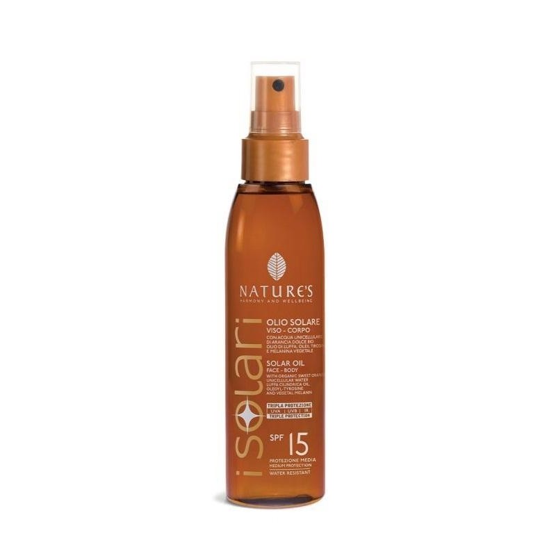 NATURE'S iSolari OLIO SOLARE SPF 15 Descrizione Pensato per chi desidera un colore intenso in tempi rapidi, l’Olio Solare Viso-Corpo iSolari protegge la pelle favorendo un’abbronzatura luminosa e duratura. La texture leggera, trasparente e a rapido assorbimento si fissa perfettamente sulla pelle, resistendo all’acqua e al sudore. La sua formula, a base di attivi naturali, contiene Acqua Unicellulare di Arancia dolce bio, ad azione antiossidante, olio di Luffa, Oleil Tirosina e Melanina vegetale, che potenzia l’azione della melanina naturale assicurando un’abbronzatura uniforme e duratura. L’Olio Solare iSolari, grazie alla leggerezza della sua texture, è ideale anche per i capelli, li mantiene idratati e nutriti, proteggendoli dall’eccessiva esposizione al sole e della salsedine, aiutando a preservarne il colore. Il fattore di protezione medio SPF15 è adatto ai fototipi scuri o quando la pelle è già abbronzata. Resistente all'acqua. Anti-sabbia. 100% filtri fotostabili. Non contiene: parabeni, siliconi, profumo. Elevata % di ingredienti di origine naturale. Dermatologicamente testato. Nickel tested. Formula vegan, con ingredienti biodegradabili. Conservazione Conservare a temperatura ambiente. Validità a confezione integra: 36 mesi. Validità dopo la prima apertura: 12 mesi. Formato Flacone da 150 ml. Cod. 60041684