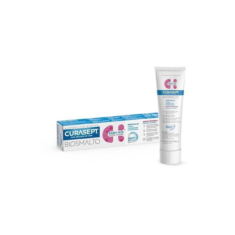 CURASEPT BIOSMALTO DENTIFRICIO CARIE ABRASIONE & EROSIONEBABY-KID Descrizione Dentifricio gusto fragola, senza fluoro.Ideale per bambini, dai 6 mesi ai 6 anni, che assumono integratori a base di fluoro.Previene la carie dei denti da latte in abbinamento a manovre di igiene orale meccanica e a una dieta povera di carboidrati, favorisce un sano sviluppo dei denti permanenti, protegge e remineralizza saldamente smalto e dentina. Avvertenze Non deglutire, uso esterno. Tenere fuori dalla portata dei bambini. Dopo l'uso non disperdere il contenitore nell'ambiente. Conservazione Tenere lontano da fonti di luce e calore. Formato Tubetto da 50 ml. Cod. CS02305