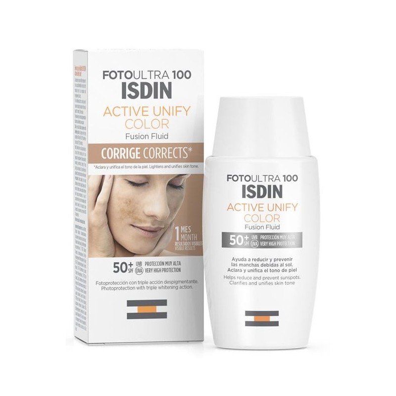 Foto Ultra 100 ISDIN ACTIVE UNIFY COLOR Descrizione Schiarisce e uniforma l'incarnato. Aiuta a ridurre e prevenire le alterazioni pigmentarie causate dal sole. Aiuta a regolare la produzione di melanina grazie al DP3-Unify Complex, che agisce sulle principali fasi della melanogenesi. Uniforma il tono della pelle grazie alla sua formulazione colorata. Offre una protezione contro i raggi UVA, responsabili del processo di pigmentazione, 2 volte superiore al minimo richiesto da un fotoprotettore solare SPF 50+. SPF 106. UVA 49. La sua texture Fusion Fluid si fonde con la pelle. Modalità d'uso Applicare mattina e mezzogiorno. Riapplicare ogni 2 ore e tanto frequentemente quanto necessario. Per un risultato ottimale, applicare per almeno 3 mesi. Componenti Aqua (Water), Dibutyl Adipate, Cyclopentasiloxane, Octocrylene, Niacinamide, Alcohol Denat., Titanium Dioxide [nano], CI 77891 (Titanium Dioxide), Butyl Methoxydibenzoylmethane, Cyclohexasiloxane, Bis-Ethylhexyloxyphenol Methoxyphenyl Triazine, PEG-30 Dipolyhydroxystearate, Glycerin, Nylon-12, PEG-10 Dimethicone, Sodium Chloride, Phenoxyethanol, Silica, Dimethicone, Phenylethyl Resorcinol, CI 77492 (Iron Oxides), Disteardimonium Hectorite, Panthenol, Tocopheryl Acetate, Allantoin, Glyceryl Stearate, CI 77491 (Iron Oxides), Parfum (Fragrance), Aluminum Hydroxide, CI 77499 (Iron Oxides), Disodium EDTA, Ethylhexylglycerin, Dimethiconol, PEG-8, Sodium Lauroyl Glutamate, Lysine, Tocopherol, Magnesium Chloride, Tetrapeptide-30, Ascorbyl Palmitate, Ascorbic Acid, Citric Acid. Conservazione Conservare a temperatura compresa tra 8 e 25°C. Validità a confezionamento integro: 36 mesi. Formato Flacone da 51,5 g. Cod. 690016046