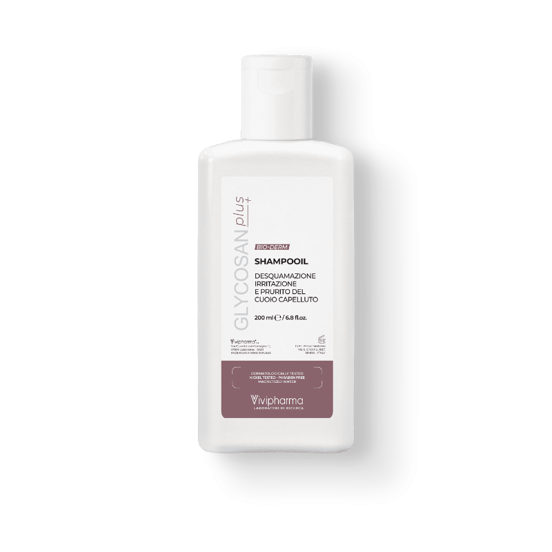 Glycosan Plus BIO-DERM SHAMPOOIL coadiuvante nelle dermatiti e psoriasi. Per lavaggi frequenti. Modalità d'uso: applicare sul cuoio capelluto e sui capelli inumiditi massaggiando delicatamente. Lasciare agire qualche minuto. Risciacquare con abbondante acqua tiepida. Se necessario ripetere l'applicazione. Per la sua composizione naturale genera una leggerissima schiuma che rispetta il film protettivo del capello. Può essere utilizzato per detergere il corpo; poche gocce su una spugna inumidita. Caratteristiche: detergente eudermico iperlenitivo, si compone essenzialmente di ingredienti tensioattivi di natura lipidica, soprattutto di origine vegetale quali olii di Avocado e Olivo le cui caratteristiche chimico-fisiche attraggono per affinità sebo e particelle di sporco presenti sul cuoio capelluto e sui capelli solubilizzandole e rimuovendole attraverso il risciacquo. La proprietà biologica protettiva, antiirritativa deriva invece dalla presenza di Zinco (Smithsonite) che svolge un'azione barriera pelle-atmosfera nella cute con turnover cellulare alterato. Nutre il capello in profondità fornendo derivati da Kigelia, Ginkgo, Cannella, un mix di attivi che rinforzano, rivitalizzano e ristrutturano i capelli dalla radice alla punta. La nota profumata del prodotto è assolutamente priva di sostanze allergeniche. Ipoallergenico, clinicamente testato. Cod. 030911022