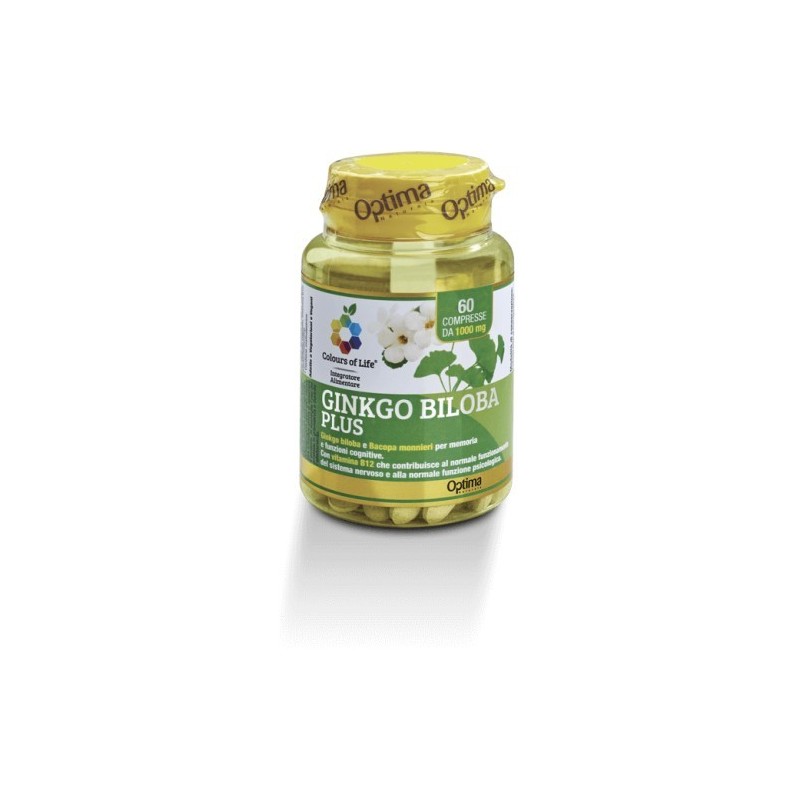Colours of Life GINKGO BILOBA PLUS Descrizione Integratore alimentare in compresse a base di estratto di Ginkgo biloba titolato al 24% in ginkgoflavonglucosidi, estratto di Bacopa monnieri titolato al 20% in bacosidi e vitamina B12. Ginkgo biloba e Bacopa monnieri per memoria e funzioni cognitive. La vitamina B12 contribuisce al normale funzionamento del sistema nervoso e alla normale funzione psicologica. Adatto a vegetariani e vegani. Ingredienti Agenti di carica: cellulosa, maltodestrina, fosfati di calcio; ginkgo (Ginkgo biloba L.) foglie polvere, ginkgo (Ginkgo biloba L.) foglie e.s. titolato 24% in ginkgoflavonglucosidi, bacopa [Bacopa monnieri (L.) Wettst.] erba e.s. titolato 20% in bacosidi, agenti antiagglomeranti: sali di magnesio degli acidi grassi e biossido di silicio; vitamina B12 (cianocobalamina). Senza glutine. Senza lattosio. Caratteristiche nutrizionali Valori medi attivi funzionaliper dose massimagiornaliera (2 compresse) Ginkgo polvere200 mg Ginkgo e.s. di cui ginkgoflavonglucosidi150 mg 36 mg Vitamina B1210 mcg (400% VNR*) *VNR: Valori Nutritivi di Riferimento. Modalità d'uso Assumere una o due compresse al giorno prima dei pasti con un po' d'acqua o altra bevanda. Avvertenze Non eccedere la dose giornaliera consigliata. Tenere fuori dalla portata dei bambini di età inferiore ai 3 anni. Gli integratori alimentari non vanno intesi come sostituti di una dieta variata e di uno stile di vita sano. Se si stanno assumendo farmaci anticoagulanti o antiaggreganti piastrinici, consultare il medico prima di assumere il prodotto. Si sconsiglia l'uso del prodotto in gravidanza e durante l'allattamento. Conservazione Conservare a temperatura inferiore a 30°C, evitare l'esposizione a fonti di calore localizzate, ai raggi solari e tenere al riparo dall'umidità. Il termine minimo di consumo si riferisce al prodotto correttamente conservato in confezione integra. Formato Confezione da 60 compresse da 1000 mg cad. Cod. NVI11024