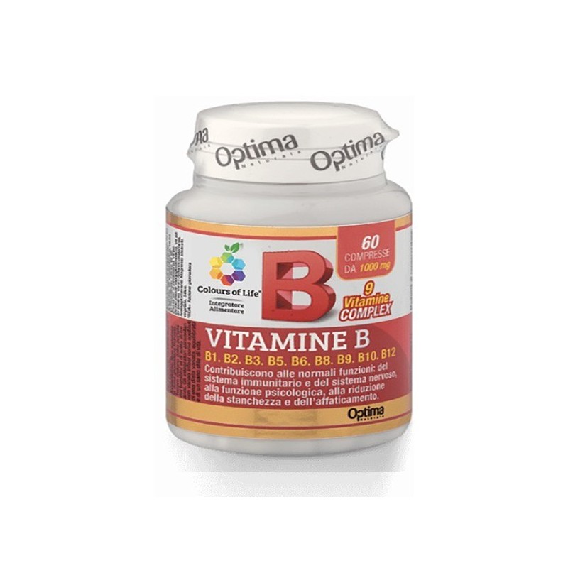 Colours of Life VITAMINE B COMPLEX B1, B2, B3, B5, B6, B8, B9, B10, B12 Descrizione Integratore alimentare in compresse a base di 9 Vitamine del gruppo B: B1, B2, B3, B5, B6, B8, B9, B10, B12. Contribuiscono alle normali funzioni del sistema nervoso alla funzione psicologica, alla riduzione della stanchezza e dell'affaticamento. Adatto a vegetariani e vegani. Ingredienti Maltodestrina da mais, agente di carica: cellulosa; addensante: fosfati di calcio; vitamina B10 (PABA Acido paraminobenzoico), vitamina B3 (nicotinamide), vitamina B1 (cloridrato di tiamina), vitamina B2 (riboflavina), vitamina B5 (calcio-D-pantotenato), vitamina B6 (cloridrato di piridossina), vitamina B9 acido folico (acido pteroil- monoglutammico), vitamina B8 (D-biotina), vitamina B12 (cianocobalamina), agenti antiagglomeranti: biossido di silicio e sali di magnesio degli acidi grassi. Senza glutine. Senza lattosio. Caratteristiche nutrizionali Valori medi attivi funzionaliper dose massimagiornaliera (2 compresse)%VNR* Vitamina B1 (tiamina)25 mg2272,7% Vitamina B2 (riboflavina)25 mg1785,7% Vitamina B3 (nicotinamide)36 mg225% Vitamina B5 (acido pantotenico)18 mg300% Vitamina B6 (piridossina)9,5 mg678,9% Vitamina B8 (biotina)450 mcg900% Vitamina B9 (acido folico)400 mcg200% Vitamina B12 (cianocobalamina)25 mcg1000% Vitamina B10 (PABA)40 mg- *VNR: Valori Nutritivi di Riferimento. Modalità d'uso Assumere una o due compresse al giorno prima dei pasti con un po' d'acqua o altra bevanda. Avvertenze Non eccedere la dose giornaliera consigliata. Tenere fuori dalla portata dei bambini di età inferiore ai 3 anni. Gli integratori alimentari non vanno intesi come sostituti di una dieta variata e di uno stile di vita sano. Conservazione Conservare a temperatura inferiore a 30°C, evitare l'esposizione a fonti di calore localizzate, ai raggi solari e tenere al riparo dall'umidità. Il termine minimo di consumo si riferisce al prodotto correttamente conservato in confezione integra. Formato 60 compresse da 1000 mg cad. Cod. NVI11014