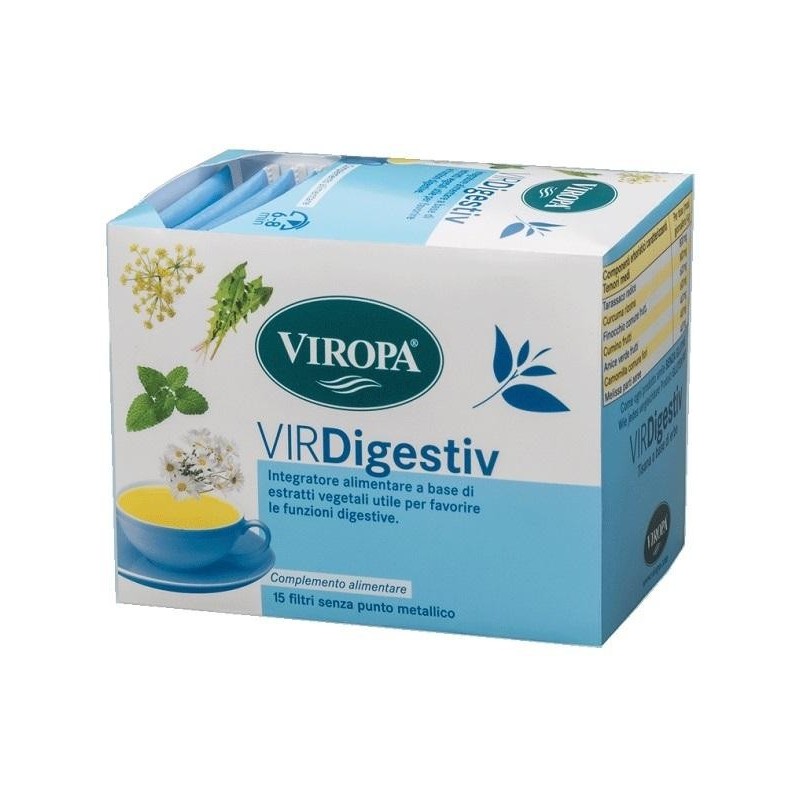 VIROPA VIRDIGESTIV Descrizione Complemento alimentare a base di tarassaco, finocchio, cumino, anice verde, camomilla e melissa per le funzioni digestive. Modalità d'uso Versare in una tazza acqua bollente (200 ml - 100 °C), inserire un filto e attendere 6-8 minuti. Conservazione Conservare in un luogo fresco e asciutto. Validità a confezionamento integro: 36 mesi. Formato Astuccio da 15 filtri. Cod. 0565