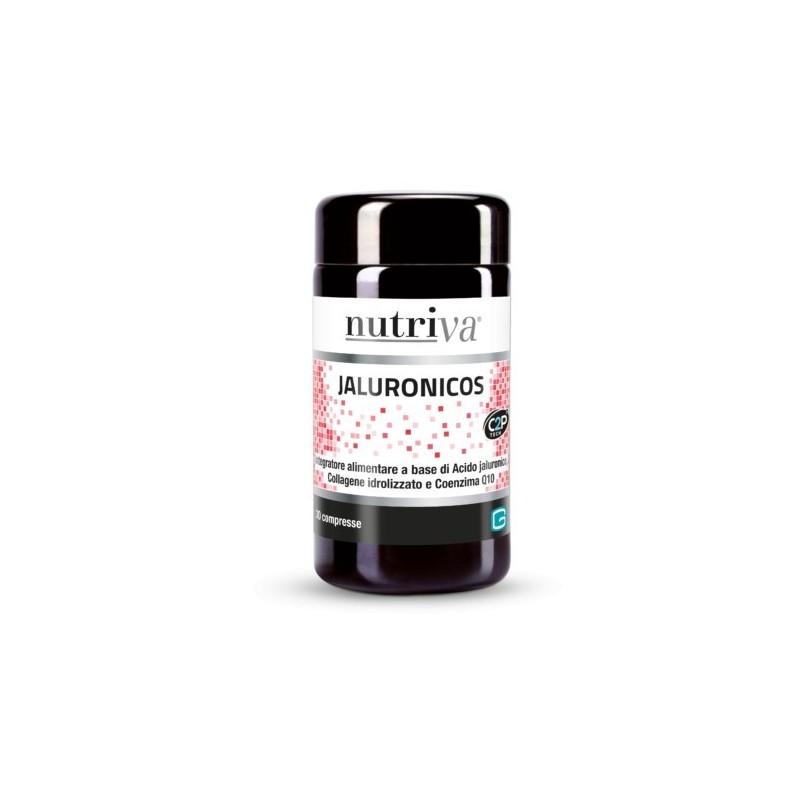 nutriva JALURONICOS Grazie alla sinergia dei principi attivi è indicato per la protezione contro l'invecchiamento cutaneo, il benessere della pelle, la rigenerazione cellulare e la secchezza oculare. Il prodotto è privo di zuccheri, sale, amido, latte e derivati, glutine, soia, coloranti ed aromi artificiali, OGM. Adatto a vegetariani e vegani. Ingredienti Sodio jaluronato, collagene idrolizzato tipo II, coenzima Q10, agente di carica: cellulosa microcristallina; antiagglomeranti: silice colloidale, magnesio stearato vegetale. Modalità d'uso Assumere 1 compressa al giorno con acqua, preferibilmente al pasto. Avvertenze Controindicato in soggetti con ipersensibilità accertata verso uno qualsiasi dei componenti. Da non assumere in gravidanza e allattamento. Una particolare attenzione va fatta in caso di terapia farmacologica (anticoagulanti, antiaggreganti piastrinici). Formato 30 compresse da 900 mg. Cod. 17534