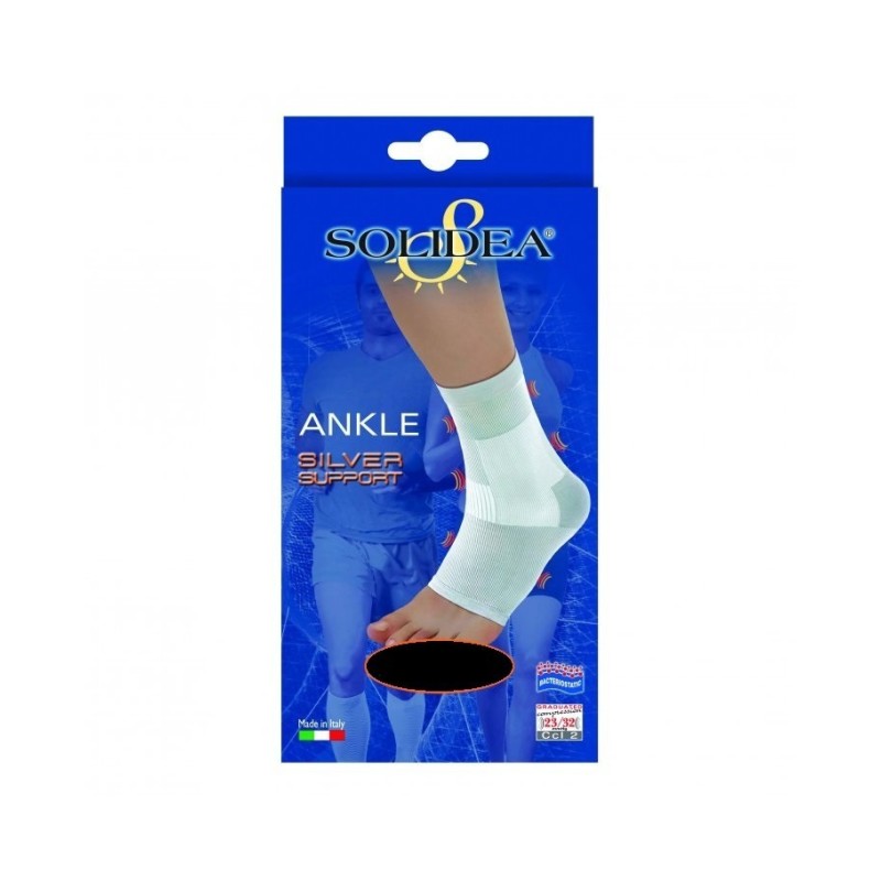 SOLIDEA Silver Support CaviglieraCavigliera elastica, con compressione graduata 23/32 mmHg, morbida e confortevole. Si indossa facilmente grazie alla adattabilità del tessuto. Con fasce rinforzate sui lati in corrispondenza del malleolo e con morbida sede per il tallone, sostiene l’articolazione agevolandone il corretto movimento. Ideale come protezione durante la pratica sportiva, in caso di distorsioni, tendinite, lussazioni, instabilità della caviglia e nella fase riabilitativa come sostegno passivo. Realizzata in filato batteriostatico agli ioni d’argento che ostacolano la proliferazione batterica e mantengono inalterato l’equilibrio naturale della pelle.Colore: nero. Componenti 75% poliammide, 25% elastan. Formato Taglie disponibili: 1-S, 2-M, 3-ML, 4-L, 5-XL. Cod.392B8SOSMC901/392B8SOSMC902/392B8SOSMC903/ 392B8SOSMC904/392B8SOSMC905