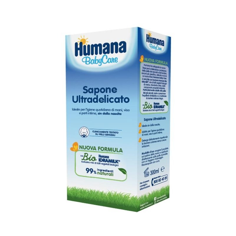 Humana BabyCare Sapone Ultradelicato Descrizione Sapone ultradelicato, ideale per l’igiene quotidiana di mani, viso e parti intime, sin dalla nascita. Deterge delicatamente rispettando la barriera cutanea senza creare irritazioni. Questo prodotto è realizzato con il 99% di ingredienti di origine naturale. L’elevata naturalità della formula può comportare variazioni di colore, che non alterano la qualità del prodotto. Il restante 1% è composto da ingredienti che aiutano a conservare il prodotto e a migliorarne l’esperienza di utilizzo. Humana ha sviluppato la nuova linea per la detersione e protezione della pelle dei neonati e dei bambini, ancora più specifica, delicata e sicura. La nuova linea Humana Baby Care è arricchita con l’esclusivo Humana Bio Idramilk, mix di latti vegetali biologici di avena, mandorla e riso, dalla comprovata proprietà idratante. Particolarmente adatto alla pelle dei più piccoli, aiuta a preservare l’equilibrio idrolipidico e a mantenere la barriera cutanea integra. Clinicamente testato su pelli sensibili. Senza alcool, parabeni e siliconi. Modalità d'uso Erogare il prodotto sul palmo della mano e applicare direttamente sulla pelle inumidita con un leggero massaggio. Risciacquare con cura. Componenti Aqua, sodium coco-sulfate, coco-glucoside, ammonium coco-sulfate, glycerin, cocamidopropyl betaine, sodium cocoyl glutamate, potassium lactate, sodium gluconate, Centaurea cyanus flower extract, glyceryl oleate, Avena sativa kernel extract, Oryza sativa bran oil, Prunus amygdalus dulcis fruit extract, propanediol, Xanthan gum, citric acid, magnesium aluminum silicate, parfum, sodium benzoate, potassium sorbate, sorbic acid. Avvertenze Solo per uso esterno. Conservazione Conservare a temperatura ambiente. Validità post-apertura: 12 mesi. Formato Flacone da 300 ml. Cod. 65118
