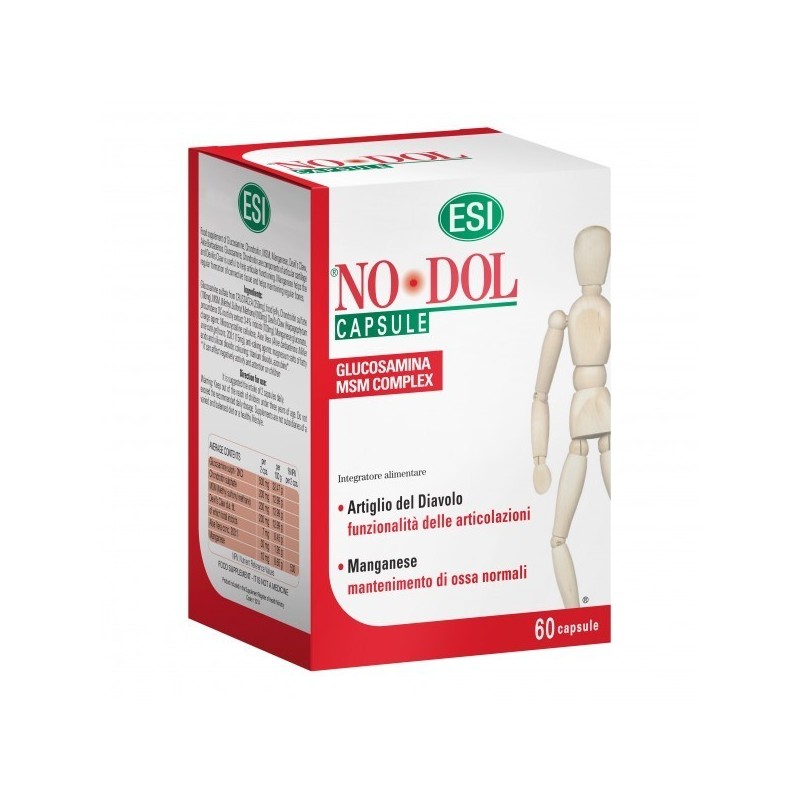 NO•DOL CAPSULE Integratore alimentare a base di glucosammina, condroitin solfato, MSM, manganese, artiglio del diavolo, aloe barbadensis. La glucosamina, il condroitin solfato e l'artiglio del diavolo risultano utili per favorire la flessibilità e la mobilità articolare. Il manganese contribuisce alla normale formazione di tessuti connettivi ed al mantenimento di ossa normali. L'aloe vera risulta utile per la sua azione antiossidante e per proteggere le cellule dai radicali liberi. Non contiene: derivati del latte, zuccheri aggiunti, conservanti aggiunti, aromi artificiali, ogm. Ingredienti  per 2 capsule Artiglio del diavolo estratto titolato    di cui iridoidi totali200,00 mg7,0 mg Aloe vera estratto concentrato 200:130,00 mg Glucosamina solfato500,00 mg Condroitin solfato200,00 mg MSM (Metil sulfonil metano)200,00 mg Manganese10,00 mg Modalità d'uso Si consiglia l'assunzione di 2 capsule al giorno con abbondante acqua. Avvertenze Per donne in gravidanza o in allattamento e bambini si raccomanda di sentire il parere del medico. Non superare la dose giornaliera raccomandata. Tenere fuori dalla portata dei bambini al di sotto dei 3 anni di età. Gli integratori non vanno intesi come sostituti di una dieta variata. Formato 60 capsule in blister. Cod. 0180