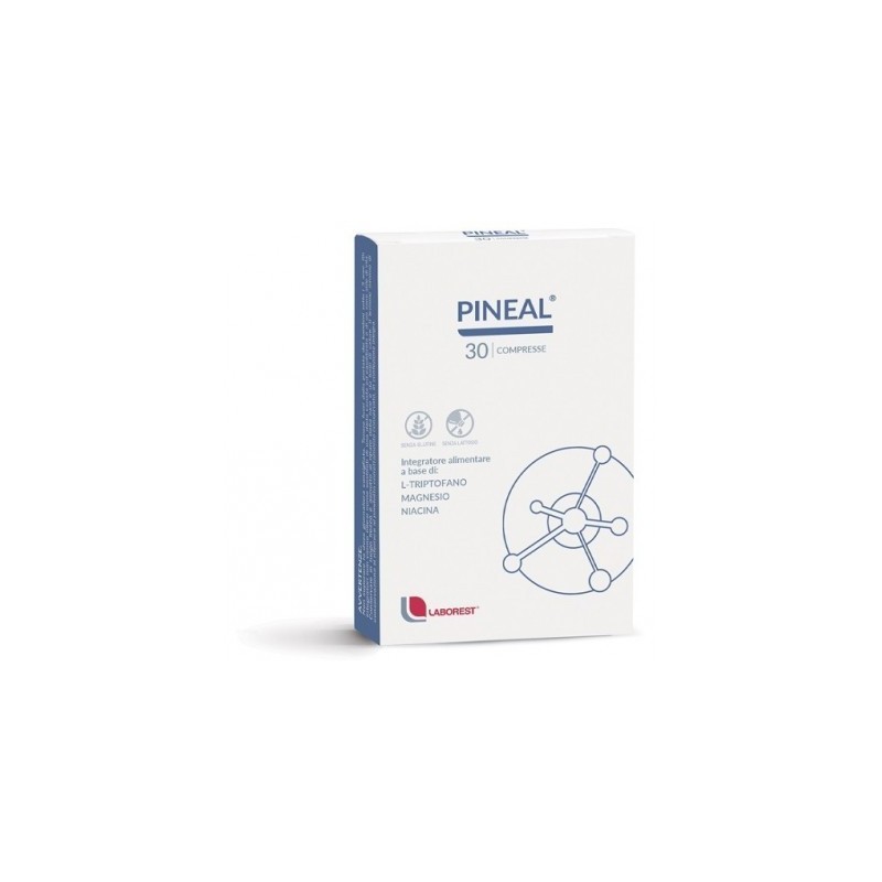 Pineal Descrizione Integratore alimentare a base di L-triptofano, magnesio e niacina, utili per apportare una quota supplementare di tali nutrienti in caso di ridotto apporto con l’alimentazione o di aumentati fabbisogni. La formula di Pineal si completa con la presenza di magnesio e niacina, che contribuiscono al normale metabolismo energetico, al normale funzionamento del sistema nervoso, alla normale funzione psicologica e alla riduzione della stanchezza e dell’affaticamento. Senza glutine e lattosio. Caratteristiche nutrizionali Valori medi per 2 compresse %VNR* Triptofano 350 mg   Magnesio 90 mg 24% Niacina 25 mg 156% *VNR: Valori Nutritivi di Riferimento Modalità d'uso Si consiglia di assumere 2 compresse di Pineal® alla sera prima di coricarsi. Avvertenze Non superare la dose giornaliera consigliata. Tenere fuori dalla portata dei bambini al di sotto dei 3 anni di età. Gli integratori alimentari non vanno intesi come sostituti di una dieta variata ed equilibrata e di uno stile di vita sano. Formato 30 compresse.