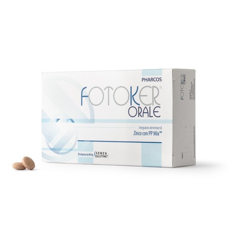 FOTOKER ORALE Integratore alimentare di Zinco ed estratti di Polypodium leucotomos e Melograno. Lo Zinco contribuisce alla normale sintesi del DNA; il polypodium leucotomos è utile per il trofismo e la funzionalità della pelle, mentre il melograno ha azione antiossidante. In base alle dichiarazioni allergeni degli ingredienti, Fotoker Oraloe non contiene nessuno degli allergeni secondo la normativa vigente (Allegato III bis Direttiva 2007/68/CE). Ingredienti Polypodium (Polypodium leucotomos L.) sommità e rizoma estratto secco E/D 1:4 (polypodium, maltodestrina); zinco gluconato; melograno (Punica granatum L.) pericarpo e frutto estratto secco titolato minimo 40% in acido ellagico; melograno (Punica granatum L.) pericarpo estratto secco titolato minimo 40% in punicoside; antiagglomeranti: magnesio stearato; talco. Modalità d'usoSi consiglia di assumere una compressa al giorno. Avvertenze Non superare la dose giornaliera consigliata. Tenere fuori dalla portata dei bambini al di sotto dei 3 anni di età. Gli integratori non vanno intesi come sostituti di una dieta variata. Per donne in gravidanza o in allattamento e bambini si raccomanda di sentire il parere del medico. Conservazione Conservare in luogo fresco e asciutto. Caratteristiche nutrizionali per 1 compressa*%VNR/ compressa Polypodium estratto secco E/D 1:4 490 mg Melograno estratto secco titolato minimo 40% in acido ellagico pari ad acido ellagico 49 mg 19,6 mg Melograno estratto secco titolato minimo 40% in punicoside pari a punicoside 21 mg 8,4 mg Zinco 10 mg 100 *% VNR= percentuale del valore nutritivo di riferimento (Reg. UE n.1169/2011). Formato Confezione da 30 compresse da 640 mg.