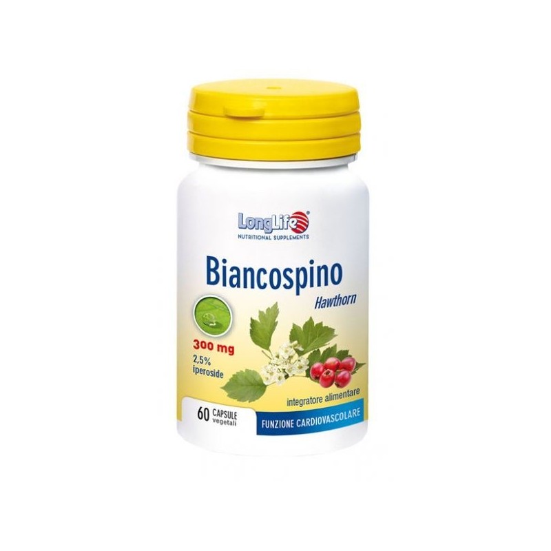 LongLife Biancospino 300 mg Descrizione Integratore alimentare di biancospino. Il biancospino, oltre a possedere proprietà antiossidanti, favorisce la funzionalità dell'apparato cardiovascolare, la regolarità della pressione arteriosa, il rilassamento e il benessere mentale. Adatto a vegetariani e vegani. Ingredienti Biancospino (Cratageus rhipidophylla Grand.) estratto (3/4:1) secco titolato 2,5% iperoside (metodo UV) foglie e fiori, maltodestrina, agente di carica (cellulosa microcristallina), antiagglomeranti (magnesio stearato vegetale e biossido di silicio). Capsula di origine vegetale in idrossipropilmetilcellulosa. Senza glutine. Caratteristiche nutrizionali Valori mediPer 2 capsule Biancospino parte aerea con fioriestratto (3/4:1) secco titolato 2,5 % iperoside (metodo UV)600 mg15 mg Modalità d'uso Assumere due o tre capsule al giorno con acqua durante i pasti. Avvertenze Gli integratori alimentari non vanno intesi come sostituto di una dieta variata e vanno utilizzati seguendo uno stile di vita sano ed equilibrato. Non eccedere la dose giornaliera raccomandata. Tenere fuori dalla portata dei bambini sotto i tre anni di età. Durante la gravidanza, l'allattamento si consiglia di sentire il parere del medico. Conservazione Conservare in luogo fresco e asciutto (