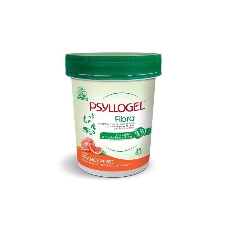 PSYLLOGELFibra Descrizione Integratore alimentare di fibra di psyllium pura al 99%, con edulcorante. Lo psyllium (plantago ovata) contenuto in Psyllogel Fibra è utile per: - favorire la regolarità del transito intestinale grazie alla formazione di feci soffici e scorrevoli - favorire l'equilibrio della flora batterica intestinale - aiutare a rallentare l'assorbimento dei nutrienti e favorire il metabolismo di carboidrati e lipidi. Gusto: arancia rossa. Ingredienti Fibra di psyllium (plantago ovata forsk., tegumentum seminis) pura al 99%; acidificante: acido citrico; estratto di sambuco; emulsionante: lecitina; aroma, maltodestrina; agente antiagglomerante: biossido di silicio; edulcorante: sucralosio. Senza glutine. Non contiene fonti di lattosio. Caratteristiche nutrizionali Valori mediper 100 gper 1 bustina (4,3 g)Energia782 kJ/194 kcal33,6 kJ/8,3 kcalGrassidi cui acidi grassi saturi1 g0,3 g0 g0 gcarboidratidi cui zuccheri1,8 g