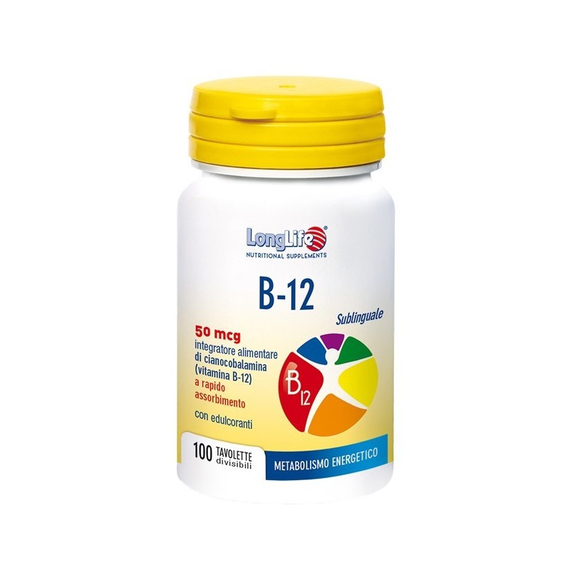 LongLife B-12 Sublinguale 50 mcg Descrizione Integratore alimentare di cianocobalamina (vitamina B12). La vitamina B12 contribuisce fisiologicamente: - al metabolismo energetico e dell'omocisteina; - alla funzione del sistema nervoso; - alla funzione psicologica; - alla formazione dei globuli rossi; - alla funzione del sistema immunitario; - alla riduzione di stanchezza e affaticamento. Adatto a vegetariani e vegani. Ingredienti Edulcorante (mannitolo), amido di mais, edulcorante (sorbitolo), succo di barbabietola, antiagglomerante (magnesio stearato vegetale), aroma (ciliegia), edulcorante (sucralosio), vitamina B12 (cianocobalamina). Senza glutine. Caratteristiche nutrizionali Valori mediPer 1 tavoletta (da 0,270 g) Vitamina B1250 mcg (2.000% VNR*) *VNR: Valori Nutritivi di Riferimento. Modalità d'uso Assumere una o due tavoletta al giorno da sciogliere sotto la lingua. Avvertenze Gli integratori alimentari non vanno intesi come sostituto di una dieta variata e vanno utilizzati seguendo uno stile di vita sano ed equilibrato. Non eccedere la dose giornaliera raccomandata. Tenere fuori dalla portata dei bambini sotto i tre anni di età. Il consumo eccessivo può avere effetti lassativi. Conservazione Conservare in luogo fresco e asciutto (