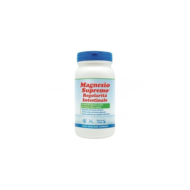 Magnesio Supremo Regolarità Intestinale Descrizione Magnesio Supremo Regolarità Intestinale, integratore alimentare con edulcorante, è una formulazione innovativa pensata per il benessere intestinale completo grazie a 4 azioni: -Azione lenitiva sul tratto intestinale. -Regolarità del transito intestinale. -Azione prebiotica per l'equilibrio della flora. -Eliminazione dei gas intestinali. La Fibra di Guar ha effetto prebiotico, utile per l'equilibrio della flora intestinale. Il Magnesio contribuisce alla normale funzione muscolare. Il Finocchio contribuisce all'eliminazione dei gas intestinali e favorisce la regolare motilità gastrointestinale. Lo Psillio favorisce il normale volume e consistenza delle feci. Favorisce la regolarità del transito intestinale e ha un'azione emolliente e lenitiva sul sistema digerente. Formula originale. Magnesio carbonato origine marina. Vegano. Ingredienti Acidificante: acido citrico; carbonato di magnesio, fibra di guar [Cyamopsis tetragonoloba (L.) Taub.] parzialmente idrolizzata, psillio cuticola del seme (Plantago ovata Forssk.) (può contenere tracce di senape e sesamo e loro prodotti derivati), finocchio (Foeniculum vulgare Mill., frutto) estratto secco titolato allo 0,5% in olio essenziale, edulcorante: glicosidi steviolici da stevia; aroma naturale, spirulina in polvere [concentrato di Spirulina platensis (Gomont) Geitler, stabilizzante: citrato trisodico]. Senza glutine e lattosio. Senza zuccheri e allergeni. Caratteristiche nutrizionali Valori medi 3 dosi VNR* Magnesio 422 mg 112% Psillio 300 mg Fibra di Guar 1.500 mg Finocchio 300 mg *VNR = valore nutritivo di riferimento. Modalità d'uso Adulti: si consiglia un dosaggio di 2 cucchiaini al giorno in una tazza o bicchiere capiente (sufficientemente grande da contenere l'effervescenza iniziale) con circa 200 ml di acqua a temperatura ambiente. In caso di bisogno è possibile assumere un terzo cucchiaino in un altro momento della giornata. È preferibile utilizzare acqua tiepida. Si suggerisce di non utilizzare acqua calda o gasata. Sarà necessario attendere la trasparenza della soluzione. Mescolare fino al termine dell'effervescenza, indice del momento ideale per l'assunzione. La formazione di agglomerati gelatinosi e particelle in soluzione è dovuta alla presenza di fibre naturali. Grazie alla presenza degli estratti vegetali la soluzione avrà una leggera e naturale colorazione verde. Nel caso si verifichi un effetto lassativo si consiglia di ridurre a mezzo cucchiaino al giorno ed una assunzione serale. In caso di sensibilità gastrica assumerlo al pasto e ridurre la quantità. In entrambi i casi è poi possibile aumentare il dosaggio fino a quello meglio tollerato. Variazioni di sapore e odore tra le confezioni sono tipiche di un prodotto naturale e non pregiudicano la qualità del prodotto. Avvertenze Non superare la dose giornaliera consigliata. Conservazione Conservare in luogo fresco e asciutto, a temperatura non superiore a 25°C, al riparo da luce diretta, fonti di calore e umidità. Validità a confezionamento integro: 30 mesi. Formato Barattolo da 150 g.