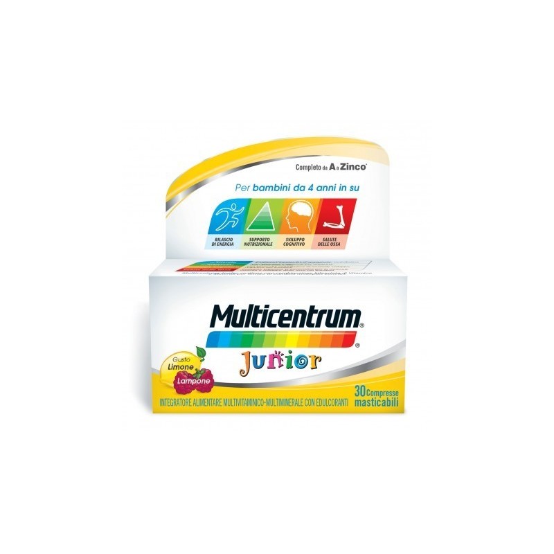 Multicentrum Junior Descrizione Integratore alimentare multivitaminico multiminerale specificatamente formulato in compresse masticabili per bambini dai 4 anni in su. Formulato tenendo presente i livelli giornalieri raccomandati di nutrienti (LARN) per bambini identificati per la popolazione italiana. Gusto lampone/limone.Senza coloranti e senza zuccheri. La presenza di xilitolo, anziché saccarosio (zucchero), rende la sua formulazione priva di azione cariogena. IngredientiEdulcorante: xilitolo, magnesio ossido, calcio fosfato bibasico, vitamina C, correttore di acidità: E330, aroma, emulsionanti: E470b, E570, ferro fumarato, agente di carica: E460, olio di palma, amido modificato, agente antiagglomerante: E551, vitamina E, nicotinamide, maltodestrine, zinco ossido, potassio cloruro, D- calcio pantotenato, edulcorante: E951, amido, gelatina, manganese solfato, vitamina B1, vitamina B6, vitamina B2, vitamina A, folato, olio di soia idrogenato, biotina, sodio selenato, antiossidante: E321, vitamina K, vitamina D, vitamina B12.Senza glutine e lattosio. Caratteristiche nutrizionali  per 1 compressa%RDA Acido Folico200 µg100% Acido Pantotenico2,5 mg42% Vitamina A*330 µg41% Biotina50 µg100% Vitamina B10,5 mg45% Vitamina B20,5 mg36% Vitamina B60,5 mg36% Vitamina B121 µg40% Vitamina C50 mg63% Vitamina D3 µg60% Vitamina E**5 mg42% Niacina***5 mg31% Ferro4,5 mg32% Manganese0,5 mg25% Selenio12,5 µg23% Zinco2,8 mg28% RDA = Dose giornaliera raccomandata per adulti in accordo alla Direttiva europea 2008/100/CE. * Espressa come retinolo equivalenti. ** Espressa come α-tocoferolo equivalenti. *** Espressa come niacina equivalenti. Modalità d'uso Una compressa al giorno da masticare, in qualsiasi momento della giornata. Avvertenze Gli integratori non vanno intesi come sostituti di una dieta varia ed equilibrata e di uno stile di vita sano. Non superare la dose giornaliera consigliata. La data di scadenza si riferisce al prodotto correttamente conservato, in confezione integra. Tenere fuori dalla portata dei bambini al di sotto dei 3 anni.Contiene aspartame (una fonte di fenilalanina). Un consumo eccessivo di xilitolo può avere effetti lassativi. Conservazione Le vitamine sono sensibili alla luce, al contatto con l’ossigeno e al calore, pertanto si consiglia di conservare il prodotto in un luogo asciutto a temperatura non superiore a 25°C, nella confezione originale ben chiusa. Formato 30 compresse