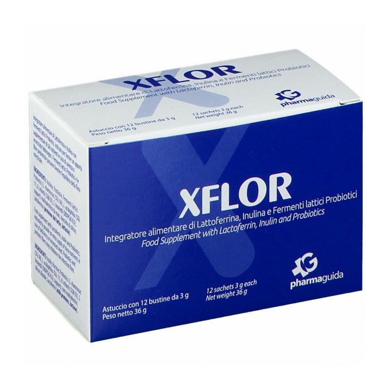 XFLOR Descrizione Integratore alimentare di lattoferrina e inulina con fermenti lattici probiotici, indicato per fornire un apporto supplementare di tali nutrienti in caso di carenza o accresciuto fabbisogno. I fermenti lattici probiotici e le fibre prebiotiche possono favorire l'equilibrio della flora intestinale. Ingredienti Inulina, fruttosio; fermenti lattici probiotici [L. rhamnosus (SGL 06), L. acidophilus (SGL 11), B. infantis (SGB 03), S. boulardii (DBVPG6763)]; supporti: maltodestrina da mais, biossido di silicio; lattoferrina (proteine del latte, lattosio). Modalità d'uso Si consiglia di assumere 1 bustina al giorno o secondo giudizio medico. Sciogliere il contenuto della bustina in poca acqua o altra bevanda (tè, succo di frutta, latte, yogurt) a temperatura ambiente. Avvertenze Non superare la dose giornaliera consigliata. Tenere fuori dalla portata dei bambini al di sotto dei 3 anni di età. Gli integratori alimentari non vanno intesi come sostituti di una dieta variata ed equilibrata e di uno stile di vita sano. Conservazione Conservare in luogo fresco (