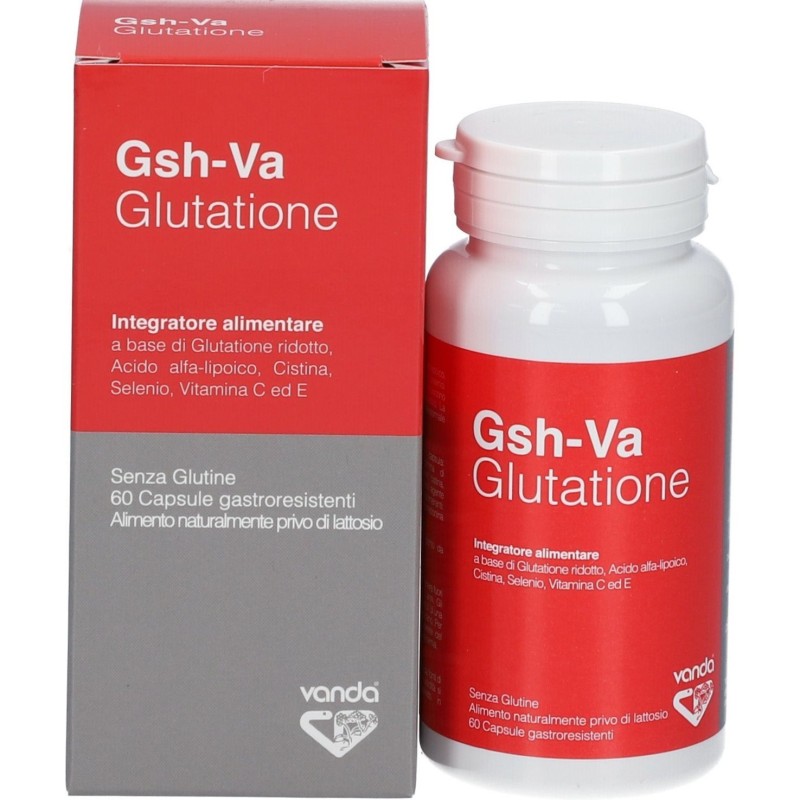 Gsh-Va Glutatione Descrizione Integratore alimentare a base di acido alfa-lipoico, glutatione ridotto, cistina, vitamina C, vitamina E, selenio. La vitamina C, la vitamina E ed il selenio contribuiscono alla protezione delle cellule dallo stress ossidativo. La vitamina C ed il selenio inoltre contribuiscono alla normale funzione del sistema immunitario. Ingredienti Acido alfa lipoico; costituenti della capsula: idrossipropilmetilcellulosa; addensante: gomma di gellano; vitamina E (acetato di DL-alfa-tocoferile), cistina, glutatione ridotto, vitamina C (acido L-ascorbico); agente di carica: cellulosa microcristallina; antiagglomeranti: magnesio stearato e biossido di silicio; L-selenometionina. Senza glutine. Naturalmente privo di lattosio. Caratteristiche nutrizionali Tenori mediPer dose giornaliera(1 capsula)%VNR* Acido alfa-lipoico112,5 mg- Cistina65 mg- Glutatione ridotto50 mg- Vitamina C50 mg62,5% Vitamina E36 mg300% Selenio20 mcg36,4% *VNR: Valori Nutritivi di Riferimento. Modalità d'uso Si consiglia l’assunzione di 1 capsula al giorno, da assumere preferibilmente lontano dai pasti. Avvertenze Non superare la dose giornaliera consigliata. Tenere fuori dalla portata dei bambini al di sotto dei 3 anni di età. Gli integratori alimentari non vanno intesi come sostituti di una dieta variata ed equilibrata e di uno stile di vita sano. Per l'uso del prodotto si consiglia di sentire il parere del medico. In rari casi l'acido lipoico può dare ipoglicemia. Conservazione Conservare in luogo fresco ed asciutto, lontano da fonti di calore e al riparo dalla luce. La data di scadenza si riferisce al prodotto integro, correttamente conservato. Validità a confezionamento integro: 36 mesi. Formato Confezione da 60 capsule gastroresistenti Peso netto 29,4 g Cod. 63149