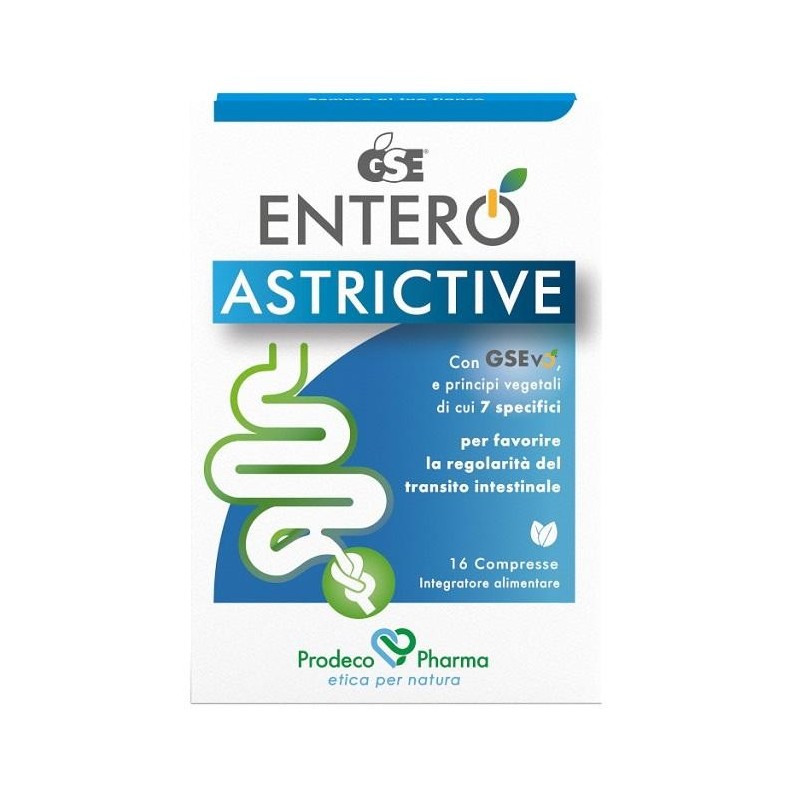 GSE ENTEROASTRICTIVE Descrizione Integratore alimentare a base di estratto di semi di pompelmo (GSEvo), ratania, quercia, carrubo, cipresso, mirtillo nero, baobab, alchemilla, agrimonia, biancospino, limone e mandarino. I componenti di GSEvo svolgono un’azione antiossidante e contribuiscono all’equilibrio microbico dell’organismo. Gli estratti di ratania, quercia, carrubo, mirtillo nero, agrimonia e alchemilla favoriscono la regolarità del tratto intestinale. Il baobab, oltre a favorire la regolarità del transito intestinale, esplica benefici effetti sulle naturali difese dell’organismo. Il biancospino favorisce il rilassamento, il benessere mentale ed esplica un’azione antiossidante. Gli oli essenziali di limone e mandarino contribuiscono alla regolare motilità gastrointestinale. Ingredienti Inulina da cicoria (Cichorium intybus L.) radice; GSEvo: pompelmo (Citrus paradisi Macfad.) semi e.s. ed estratto liofilizzato; edulcorante: xilitolo; amido di mais pregelatinizzato, ratania (Krameria triandra Ruiz & Pav) radice polvere, quercia (Quercus robur L.) corteccia polvere, carrubo (Ceratonia siliqua L.) frutti polvere, cipresso (Cupressus sempervirens L.) coni polvere, mirtillo nero (Vaccinium myrtillus L.) frutti e.s. tit. 1% antocianine, baobab (Adansonia digitata L.) frutti polvere, alchemilla (Alchemilla vulgaris L.) erba polvere, agrimonia (Agrimonia eupatoria L.) sommità polvere, biancospino (Crataegus monogyna Jacq.) fiori e foglie polvere; antiagglomeranti: biossido di silicio, sali di magnesio degli acidi grassi; aromi naturali; acidificante: acido citrico; edulcorante: glicosidi steviolici da stevia; limone [Citrus limon (L.) Osbeck] o.e., mandarino (Citrus nobilis Lour.) o.e. Senza glutine. Caratteristiche nutrizionali Valori medi per dose massimagiornaliera (6 compresse) GSEvo:di cui pompelmo semi e.s.di cui pompelmo semi estratto liofilizzato 720,00 mg600,00 mg120,00 mg Ratania radice polvere 450,00 mg Quercia corteccia polvere 420,00 mg Carrubo frutti polvere 420,00 mg Cipresso coni polvere 360,00 mg Mirtillo nero frutti e.s.di cui antocianine 360,00 mg3,60 mg Baobab frutti polvere 270,00 mg Alchemilla erba polvere 240,00 mg Agrimonia sommità polvere 240,00 mg Biancospino fiori e foglie polvere 180,00 mg Limone o.e. 30,00 mg Mandarino o.e. 18,00 mg Modalità d'uso Adulti: masticare o deglutire da 2 a 6 compresse al giorno. Bambini: masticare o deglutire da 1 a 3 compresse al giorno. Avvertenze Non superare la dose giornaliera consigliata. Tenere fuori dalla portata dei bambini al di sotto dei tre anni. Gli integratori non vanno intesi quali sostituti di una dieta variata, equilibrata e di un sano stile di vita. Evitare il contatto con l’acqua. Il termine minimo di conservazione si riferisce al prodotto in confezione integra, correttamente conservato. Conservazione Conservare in luogo fresco e asciutto al riparo da luce e da fonti dirette di calore. Validità a confezionamento integro: 36 mesi. Formato Confezione da 16 compresse. Peso netto: 19,2 g. Cod. GS01.0810.01