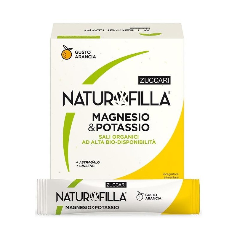 Naturofilla Magnesio&Potassio GUSTO ARANCIA Descrizione Idrosalino con magnesio e potassio organici, arricchiti con fonti naturali. Con elevata quantità di sali. Sali organici altamente bio-disponibili ristabiliscono l’equilibrio elettrolitico dell'organismo in modo naturale. Con astragalo e ginseng garantisce maggiore sostegno ed energia. Completa la formulazione la clorofilla magnesiaca. Ingredienti Ingredienti per 8 g dose giornaliera: sali di magnesio dell'acido lattico; maltodestrine; citrato di potassio; acidificante: acido citrico; aroma naturale; magnesio bisglicinato; ginseng (Panax ginseng C.A. Mey.) radice e.s. tit. 1% ginsenosidi; acqua di cocco disidratata; astragalo (Astragalus membranaceus Moench) radice e.s. tit. 70% polisaccaridi; orzo (Hordeum vulgare L.) giovani getti; banana (Musa paradisiaca L. (pro sp.)) succo del frutto disidratato; edulcorante: sucralosio; coloranti: beta carotene, clorofille (Clorofilla magnesiaca); agente antiagglomerante: biossido di silicio. Senza ogm. Senza glutine. Glycemic tested. Senza conservanti. Senza zuccheri aggiunti (contiene naturalmente zuccheri). Modalità d'uso Sciogliere il contenuto di uno stick-pack in un bicchiere d’acqua (circa 100ml) e bere subito. La formulazione consente l’assunzione di 2 stick-pack al giorno. Avvertenze Tenere fuori dalla portata dei bambini al di sotto dei 3 anni. Gli integratori alimentari non vanno intesi come sostituti di una dieta varia ed equilibrata e di uno stile di vita sano. Non eccedere la dose giornaliera raccomandata. L’uso del presente prodotto è controindicato in caso di ipersensibilità individuale accertata allo stesso e a qualunque suo componente. Con edulcorante: sucralosio. Conservazione Conservare in luogo fresco, asciutto e lontano da fonti di calore. Formato 28 stick-pack. Cod. 11117