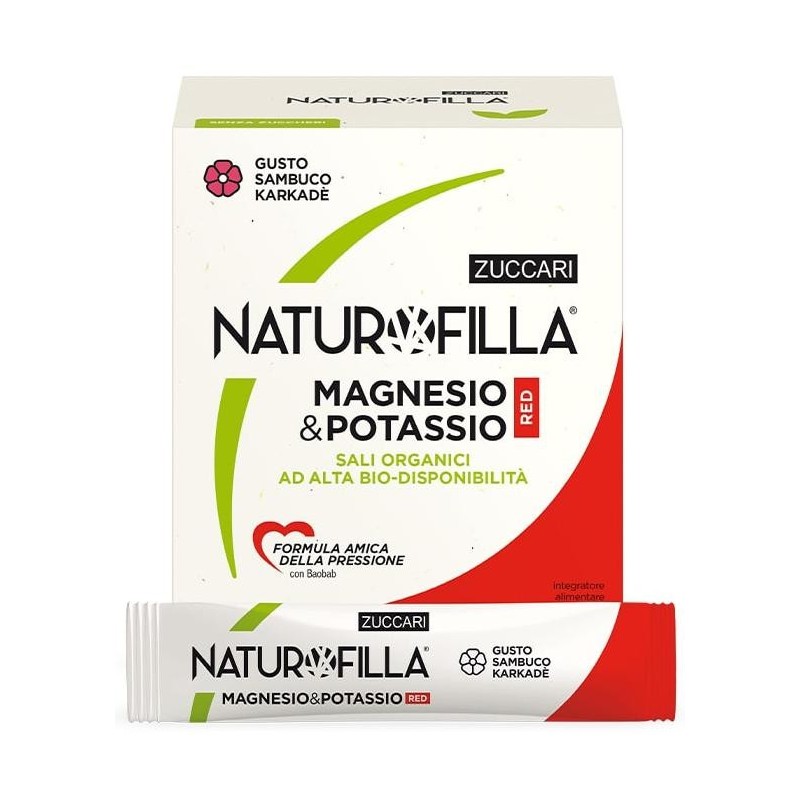 Naturofilla Magnesio&Potassio Red GUSTO SAMBUCO KARKADE' Descrizione Sali organici altamente bio-disponibili che ristabiliscono l’equilibrio elettrolitico dell'organismo in modo bilanciato e naturale. Offre un’azione regolatrice della pressione grazie a baobab e un effetto tonico con eleuterococco. La formulazione è completata da clorofilla magnesiaca. Ingredienti Ingredienti per 8 g dose giornaliera: maltodestrine; sali di magnesio dell'acido lattico; acidificante: acido citrico; citrato di potassio; aroma naturale; magnesio bisglicinato; eleuterococco (Eleutherococcus senticosus (Rupr. et Maxim.) Maxim) radice e.s. tit. 5% eleuterosidi; baobab (Adansonia digitata L.) polvere del frutto; acqua di cocco disidratata; edulcorante: sucralosio; orzo (Hordeum vulgare L.) giovani getti; melograno (Punica granatum l.) succo del frutto disidratato; agente antiagglomerante: biossido di silicio; colorante: clorofille (Clorofilla magnesiaca). Senza ogm Senza glutine. Glycemic tested. Senza conservanti. Senza zuccheri aggiunti (contiene naturalmente zuccheri). Modalità d'uso Sciogliere il contenuto di uno stick-pack in un bicchiere d’acqua (circa 100ml) e bere subito. La formulazione a basso tenore di potassio consente l’assunzione di 2 stick-pack al giorno. Avvertenze Tenere fuori dalla portata dei bambini al di sotto dei 3 anni. Gli integratori alimentari non vanno intesi come sostituti di una dieta varia ed equilibrata e di uno stile di vita sano. Non eccedere la dose giornaliera raccomandata. L’uso del presente prodotto è controindicato in caso di ipersensibilità individuale accertata allo stesso e a qualunque suo componente. Con edulcorante: sucralosio. Conservazione Conservare in luogo fresco, asciutto e lontano da fonti di calore. Formato 28 stick-pack. Cod. 11116