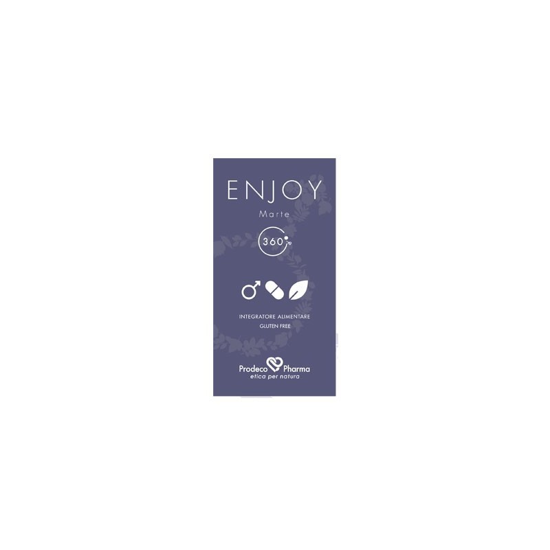 ENJOY Marte 360 Descrizione Integratore alimentare a base di Muira Puama, Maca e Zafferano. La Muira Puama svolge un'azione antiossidante e insieme alla Maca esercita benefici effetti tonici in presenza di stanchezza fisica e mentale. Lo Zafferano aiuta a mantenere il normale tono dell'umore. Ingredienti Muira puama (Ptychopetalum olacoides Benth.) corteccia estratto secco; agente di carica: cellulosa microcristallina; maca (Lepidium meyenii Walp.) radice estratto secco e radice polvere; agenti antiagglomeranti: biossido di silicio, ossido di magnesio, sali di magnesio degli acidi grassi; zafferano (Crocus sativus L.) stimmi estratto secco titolato 3% crocina. Senza glutine. Valori mediper 100 gper dose massima giornaliera (3 compresse) Muira puama corteccia estratto secco31,75 g1.200 mg Maca radice estratto secco15,87 g600 mg Maca radice polvere15,87 g600 mg Zafferano stimmi estratto seccotitolato 3% crocina0,79 g0,024 g30 mg0,90 mg Modalità d'uso Deglutire con un bicchiere d'acqua 1 compressa preferibilmente prima dei pasti principali, per 3 volte al giorno. Avvertenze Non superare la dose giornaliera raccomandata. Tenere fuori dalla portata dei bambini al di sotto dei 3 anni di età. Gli integratori non vanno intesi come sostituti di una dieta variata, equilibrata e di un sano stile di vita. Conservazione Conservare in luogo fresco e asciutto, al riparo dalla luce e da fonti dirette di calore. Il termine minimo di conservazione si riferisce al prodotto in confezione integra, correttamente conservato. Formato Astuccio da 45 compresse. Peso netto: 56,7 g.