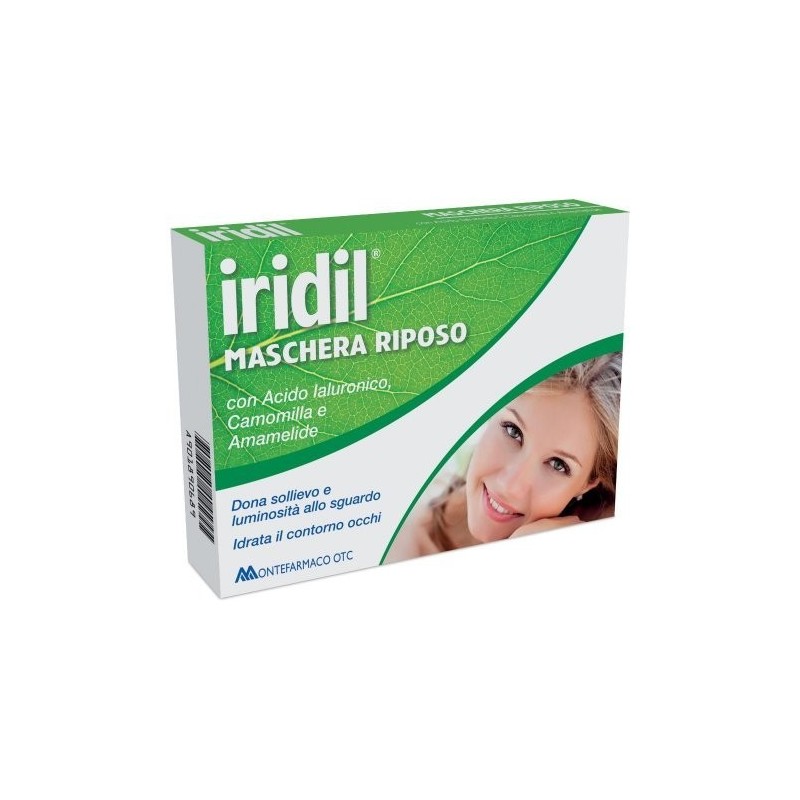 MONTEFARMACO OTC iridil MASCHERA RIPOSO con acido ialuronico Dona sollievo e luminosità allo sguardo idrata il contorno occhi Prodotto che, grazie ai principi decongestionanti e risposanti dell'Hammamelise e della Camomilla, ridona freschezza e luminosità allo sguardo. L'Acido Ialuronico aderisce alla cute e trattiene in loco le sostanze attive prolungandone l'azione. Per ottenere un migliore risultato si consiglia, prima dell'uso, di tenere la bustina in frigorifero. Formato Pezzo singolo.