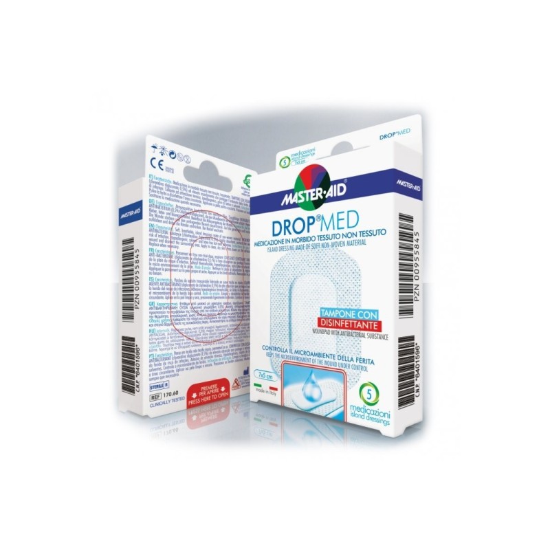 MASTER•AID DROP MED Medicazione traspirante in tessuto non tessuto, dotata di un tampone assorbente con sostanza disinfettante (clorexidina digluconato 0,5%). Collante ipoallergenico, privo di solventi e privo di lattice di gomma naturale. Supporto Morbido tessuto non tessuto. Perfetta conformabilità del prodotto. Elevato comfort per l’utilizzatore. Non spela e non sporca la ferita. Permette la traspirazione cutanea. Tampone centrale Tessuto non tessuto. Ampia superficie a contatto con la ferita. Film antiaderente microperforato. Elevata capacità assorbente. Il tampone contiene clorexidina digluconato 0,5%, potente antisettico ad ampio spettro. Collante Hot Melt Pressure Sensitive (collante termofusibile con proprietà adesive attivate dalla pressione). Elevata adesività. Ipoallergenico. Privo di solventi. Privo di lattice. Confezione Astuccio antimanomissione per una maggiore tutela del consumatore. Astuccio dotato di appendino. Per agevolare la scelta del formato più adatto sul retro degli astucci è riportata in scala 1:1 la sagoma del cerotto. Il prodotto è un dispositivo medico appartenente alla classe III secondo direttiva 93/42/CEE. CodiceFormatoContenuto 17060 17069 17070 17072 17074 17075 17076 17078 17079 17150 17082 17083 17155 171607x5 cm 10x6 cm 10x8 cm 10x12 cm 10,5x15 cm 10,5x18 cm 10,5x20 cm 10,5x25 cm 10,5x30 cm 10,5x25 cm 10,5x30 cm 12,5x12,5 cm 14x14 cm 15x17 cm5 pezzi 5 pezzi 5 pezzi 5 pezzi 5 pezzi 5 pezzi 5 pezzi 3 pezzi 3 pezzi 1 pezzi 1 pezzi 5 pezzi 5 pezzi 3 pezzi