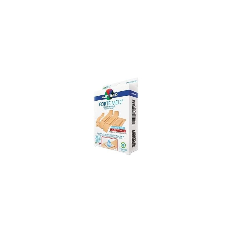 MASTER•AID FORTE MED Dispositivo medico CE 0373. Cerotti in striscia a protezione elevata. Tampone con disinfettante (clorexidina digluconato). FORTE med offre una elevata protezione della ferita dagli agenti esterni (sporcizia, batteri) grazie ad un supporto particolarmente resistente. FORTE med grazie alla microperforazione consente la traspirazione della cute evitando processi di macerazione. L'adesivo ipoallergenico è particolarmente indicato anche per le pelli più sensibili. Caratteristiche tecniche Supporto in film di polietilene. Garza tampone in tessuto non tessuto, con film antiaderente microperforato. Adesivo Hot Melt Pressure Sensitive, ipoallergenico. Formato Confezione da 5 formati: 78x20 mm, 78x26 mm, ø 25 mm, 38x38 mm, 45x12,7 mm. 40 pezzi. Confezione da 2 formati: 78x20 mm (medio) e 78x26 mm (grande). 20 pezzi. Cod. 17520 / 17525