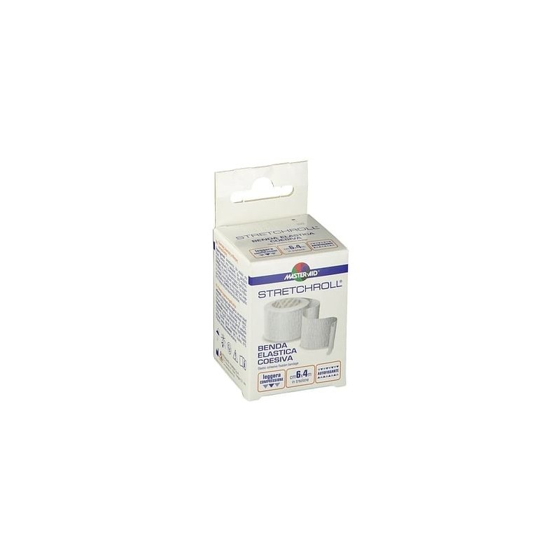 MASTER•AID STRETCHROLL                              Benda                            elastica Dispositivo medico CE. Benda elastica autobloccante: aderisce su se stessa ma non alla pelle né ai peli. Fornisce un leggero sostegno e ha una estensibilità in lunghezza del 100% circa. È altamente conformabile e offre un distacco atraumatico. Non è candeggiata, ben tollerata, permette una elevata traspirazione. Contiene lattice di gomma naturale. Indicata per il fissaggio di medicazioni o stecche ortopediche ed il trattamento di distorsioni. Adatta alla protezione della pelle nei bendaggi adesivi. Specifiche Tecniche Filato composto da viscosa 39%, poliammide 61%. Impregnato di lattice per l'auto-aderenza. Formato - cm 4 X 4 m. - cm 6 X 4 m. - cm 8 X 4 m. - cm 10 X 4 m. Cod. 31010 / 31011 / 31012 / 31013
