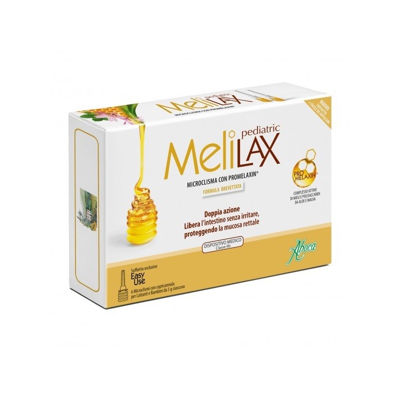 MeliLAX pediatric Descrizione Dispositivo Medico CE, classe IIb. Microclisma a base di miele, che unisce un’equilibrata azione evacuante ad un’azione protettiva e lenitiva della mucosa rettale, utile per contrastare i fastidi, l’irritazione e l’infiammazione, presenti in caso di stipsi. La doppia azione di Melilax è ottenuta grazie a PROMELAXIN, un complesso attivo di mieli di nettare e di melata appositamente selezionati e lavorati in base al loro contenuto di monosaccaridi, polisaccaridi e melanoidine, arricchito con la frazione polisaccaridica da Aloe e Malva. Melilax esplica un’azione evacuante non irritante e quindi induce uno stimolo fisiologico e bilanciato di attivazione della defecazione. Inoltre Melilax, grazie alle sue proprietà mucosimili e alla sua viscosità, protegge la mucosa rettale durante il passaggio delle feci, mimando l’azione lubrificante del muco fisiologico. Queste particolari proprietà, unite all’azione antiossidante, conferiscono al prodotto la capacità di proteggere e lenire la mucosa, esplicando un’azione antinfiammatoria indiretta dovuta alle caratteristiche fisiche del prodotto. Melilax è indicato nel trattamento della stipsi, anche in presenza di ipersensibilità viscerale (come in caso di colon irritabile), ragadi ed emorroidi. Melilax Pediatric è indicato per per bambini e lattanti. Modalità d'uso • Bambini da 3-12 anni: 1 microclisma da 5 g al bisogno. In caso di stipsi ostinata, applicare 2 dosi consecutivamente. • Bambini da 1-3 anni: 1 microclisma da 5 g al bisogno. • Lattanti da 0-1 anno: metà microclisma da 5 g al bisogno. Aprire il microclisma rimuovendo il copricannula di sicurezza: - afferrare la ghiera rotonda bianca posta sopra il soffietto; - con l’altra mano piegare il copricannula fino a provocarne la rottura e il completo distacco dalla ghiera; - sfilare il copricannula. Per facilitare l’applicazione del microclisma è preferibile posizionare il bambino sul lato sinistro con le ginocchia piegate verso l’addome. Applicare qualche goccia di prodotto nella zona perianale e introdurre delicatamente la cannula nel retto. Premere a fondo il microclisma e al termine dell’applicazione mantenerlo premuto fino ad estrazione completa della cannula, per evitare che il prodotto venga riaspirato. Ingredienti Promelaxin complesso di mieli e polisaccaridi da aloe e malva Titolo in: monosaccaridi ≥ 50%, polisaccaridi (Peso Molecolare > 20.000 Dalton) ≥ 0,3%. Contiene inoltre: miscela idroglicerica; succo di Limone; olio essenziale di Lavanda. Senza glutine. Avvertenze Non utilizzare se presente ipersensibilità o allergia individuale verso uno o più componenti. In caso di stipsi persistente è importante consultare il medico per escludere altre patologie. Il microclisma è monouso, pertanto non deve essere riutilizzato qualora se ne somministri metà dose, come nel caso dei lattanti. Tenere fuori dalla portata dei bambini. Conservazione Conservare a temperatura ambiente, lontano da fonti di calore e al riparo dalla luce. La data di scadenza si riferisce al prodotto integro e correttamente conservato. Non utilizzare dopo la data di scadenza indicata. Validità a confezionamento integro: 30 mesi. Formato 6 microclismi monouso con copricannula per bambini e lattanti da 5 g ciascuno. Cod. MELPECLX