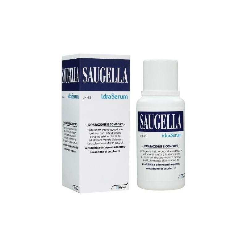 SAUGELLA idraSerum pH 4,5 Descrizione Detergente intimo quotidiano con latte di avena, maltodestrine, estratti di Salvia officinalis (salvia) e Calendula officinalis (calendula), che associa un'attività idratante ad una delicata azione detergente. Rispetta il film idrolipidico della pelle. Particolarmente utile in caso di: sensibilità a detergenti aspecifici; sensazioni di secchezza. Rispetta e mantiene l'equilibrio dell'area vulvare in età fertile e in menopausa. La formula è adatta anche al lavaggio quotidiano del corpo, anche in caso di pelli sensibili. Modalità d'uso Usare come un normale detergente da 1 a 2 volte al giorno. Agitare bene prima dell'uso. Componenti Aqua, diglycerin, sodium cocoyl wheat amino acids, glycerin, lactic acid, maltodextrin, Avena sativa kernel extract, Calendula officinalis flower extract, Salvia officinalis leaf extract, whey, xanthan gum, sodium lauryl sulfoacetate, disodium laureth sulfosuccinate, glycol distearate, glyceryl stearate, caprylyl glycol, propylene glycol, decyl glucoside, sodium levulinate, potassium palmitoyl hydrolyzed wheat protein, coco-glucoside, glyceryl oleate, parfum, sodium anisate, phenoxyethanol, ketoglutaric acid, potassium palmitoyl hydrolyzed oat protein, hydrolyzed oat protein, citric acid, potassium sorbate, sodium benzoate. Avvertenze Uso esterno. Conservazione Conservare in luogo fresco. Validità post-apertura: 12 mesi. Formato Flacone da 200 ml. Cod. 548