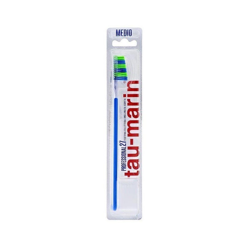 Tau-marin Professional 27 Spazzolino con una testina più piccola per raggiungere comodamente le zone più difficili del cavo orale, garantendo una spazzolata efficace e al tempo stesso delicata. Disponibile con testina in setole dure, medie o morbide. Testina ellittica scalare inclinata di 15°, per una maggio pulizia anche nei punti più difficili da raggiungere.Setole arrotondate in tynex a elasticità differenziata, resistenti nel tempo e perfette per evitare traumi a denti e gengive. Setole rigide, per rimuovere la placca, e semirigide, per massaggiare le gengive. Manico ergonomico, studiato nella forma e nella lunghezza per un'impugnatura corretta durante la spazzolata.