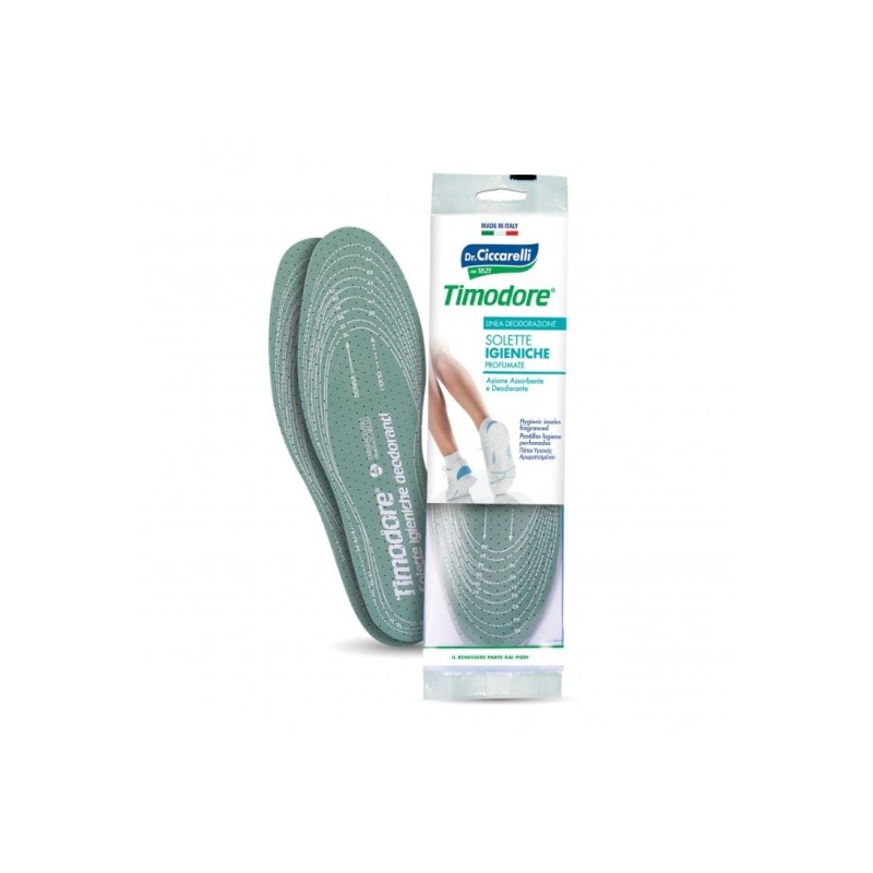 Timodore SOLETTE DEODORANTI prevengono e assorbono il cattivo odore, facilitando la ventilazione dei piedi, assicurando comfort e relax. Caratteristiche: svolgono una tripla azione grazie ai particolari elementi contenuti: ventilazione (Clorofilla), assorbimento (Schiuma di lattice) e deodorazione (Olio Essenziale di Timo). Si adattano a ogni tipo di calzatura grazie alla sagoma ritagliabile. Dermatologicamente testato. Componenti: clorofilla; schiuma di lattice; olio essenziale di timo rosso. Cod. 0111Z03