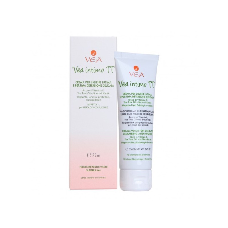 VEA Vea intimo TT Crema per l'igiene intima e per una detersione delicata. Il prodotto non contiene tensioattivi (detersione per affinità) ed è ricca di principi attivi funzionali. Rispetta il naturale pH fisiologico vulvare (pH 5.6 - 6) per evitare il bruciore che un pH acido 3.5 - 4.5 (presente in vagina e non sulla vulva) potrebbe causare specialmente in presenza di rossore e/o irritazione da cause esterne. La percentuale elevata di vitamina E, con effetto idratante, lenitivo e protettivo, aiuta a contrastare la secchezza e a prevenire le irritazioni. L’olio essenziale di Melaleuca alternifolia (tea tree oil) favorisce l’azione antimicrobica. Non contiene conservanti, coloranti e tensioattivi per minimizzare i rischi di allergia. Indicato per l’igiene intima quotidiana e per una detersione delicata, anche in bambini ed anziani, e in caso di alterazione della flora batterica vaginale conseguente a ciclo mestruale, parto, gravidanza, ecc. Il caratteristico odore del prodotto è dovuto all’alta concentrazione di tea tree oil. Modalità d'utilizzo A risciacquo: applicare una piccola quantità di prodotto nella zona da detergere, risciacquare con acqua. Senza risciacquo: applicare una piccola quantità di prodotto nella zona da trattare, si può asportare con una salvietta senz’acqua. Avvertenze Non usare in caso di allergia nota agli ingredienti. Tenere fuori dalla portata dei bambini. Conservazione Validità a confezione integra: 36 mesi. Validità dopo la prima apertura: 12 mesi. Formato Tubo da 75 ml. BREVETTO DEPOSITATO.